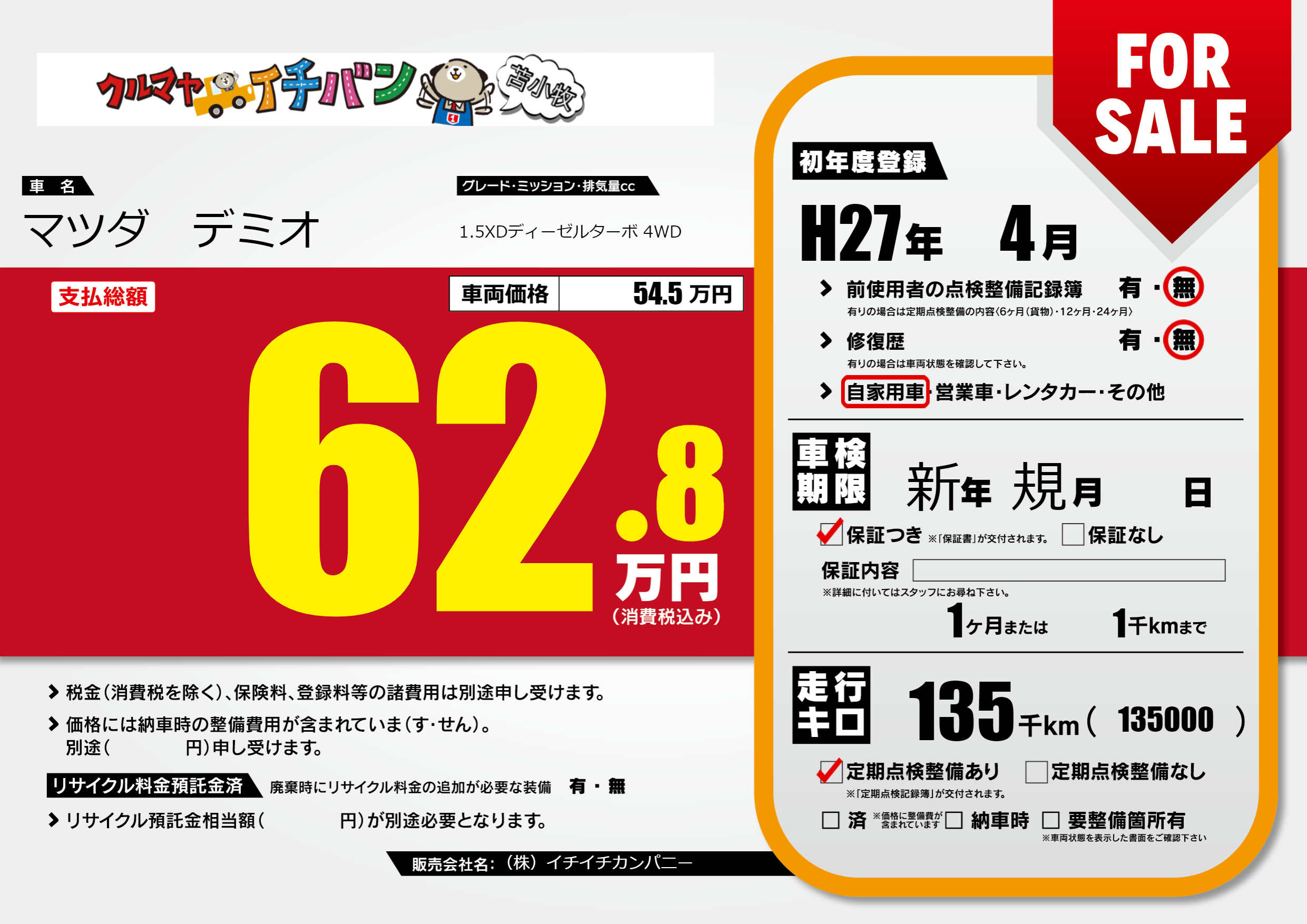 | 車名 | マツダ デミオ | グレード ミッション 排気量 |