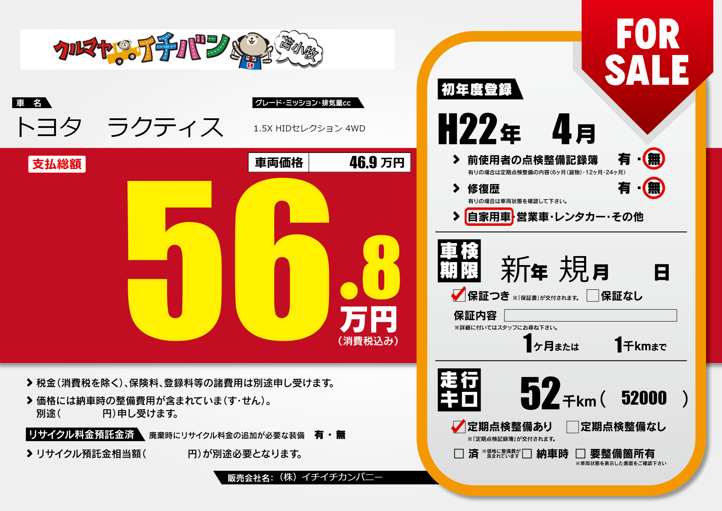 | 車名 | トヨタ ラクティス | グレード ミッション 排気量 |