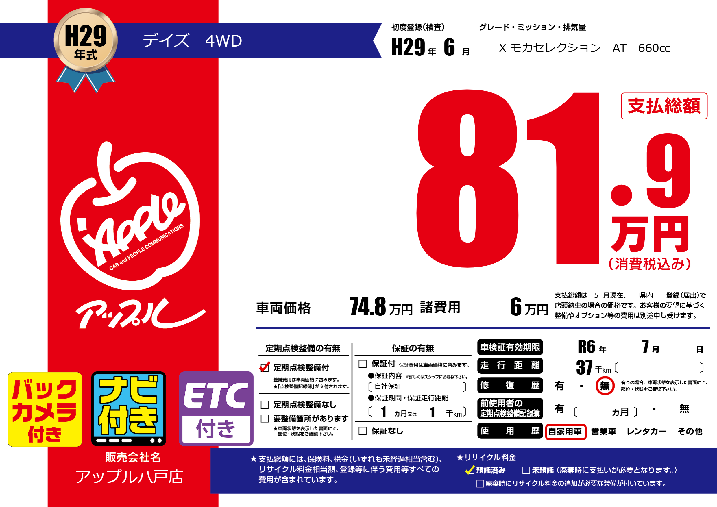 | 車名 | デイズ 4WD | グレード ミッション 排気量 |