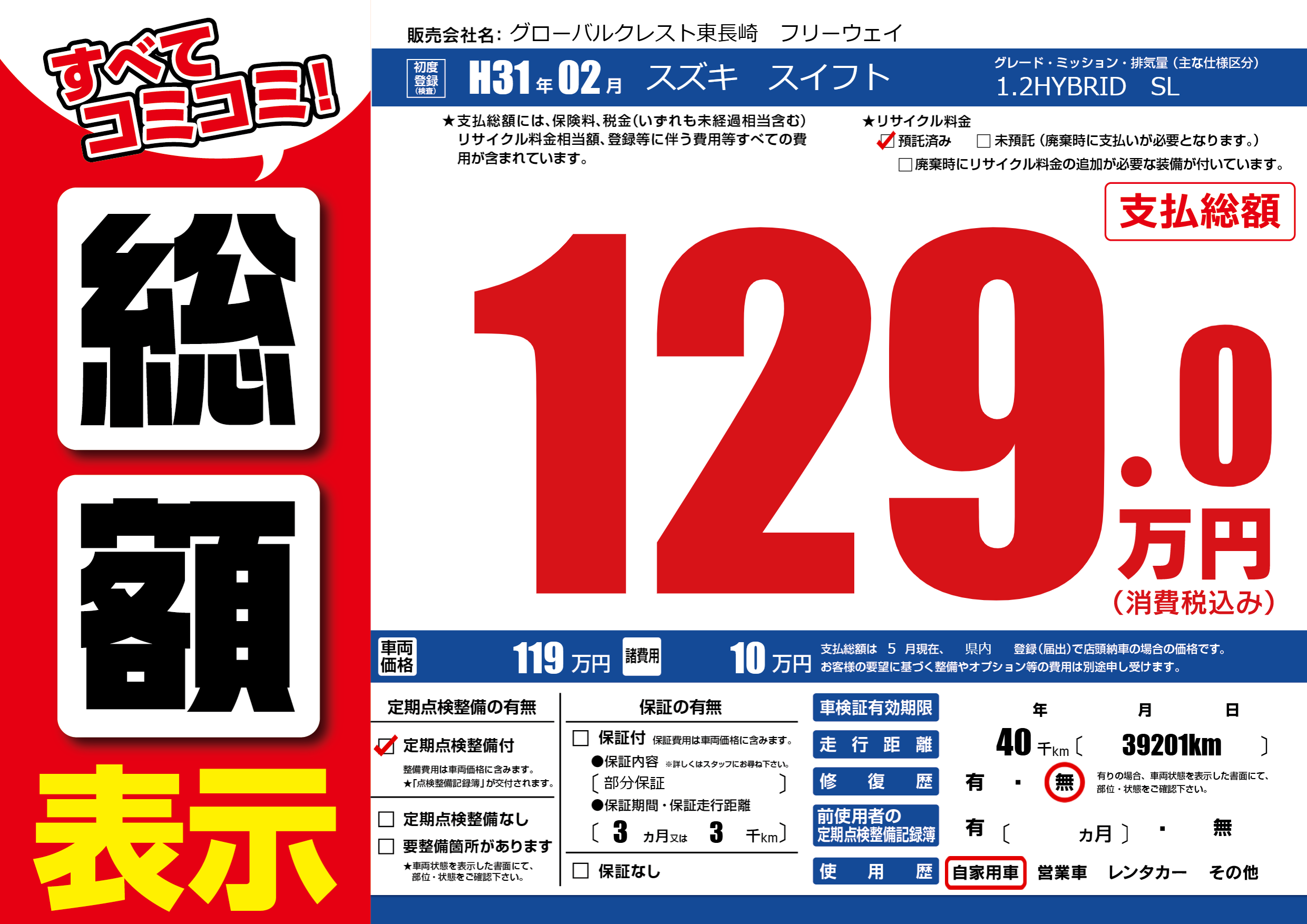 | 走行キロ | 4万km | 初年度登録 | H31年02月 |