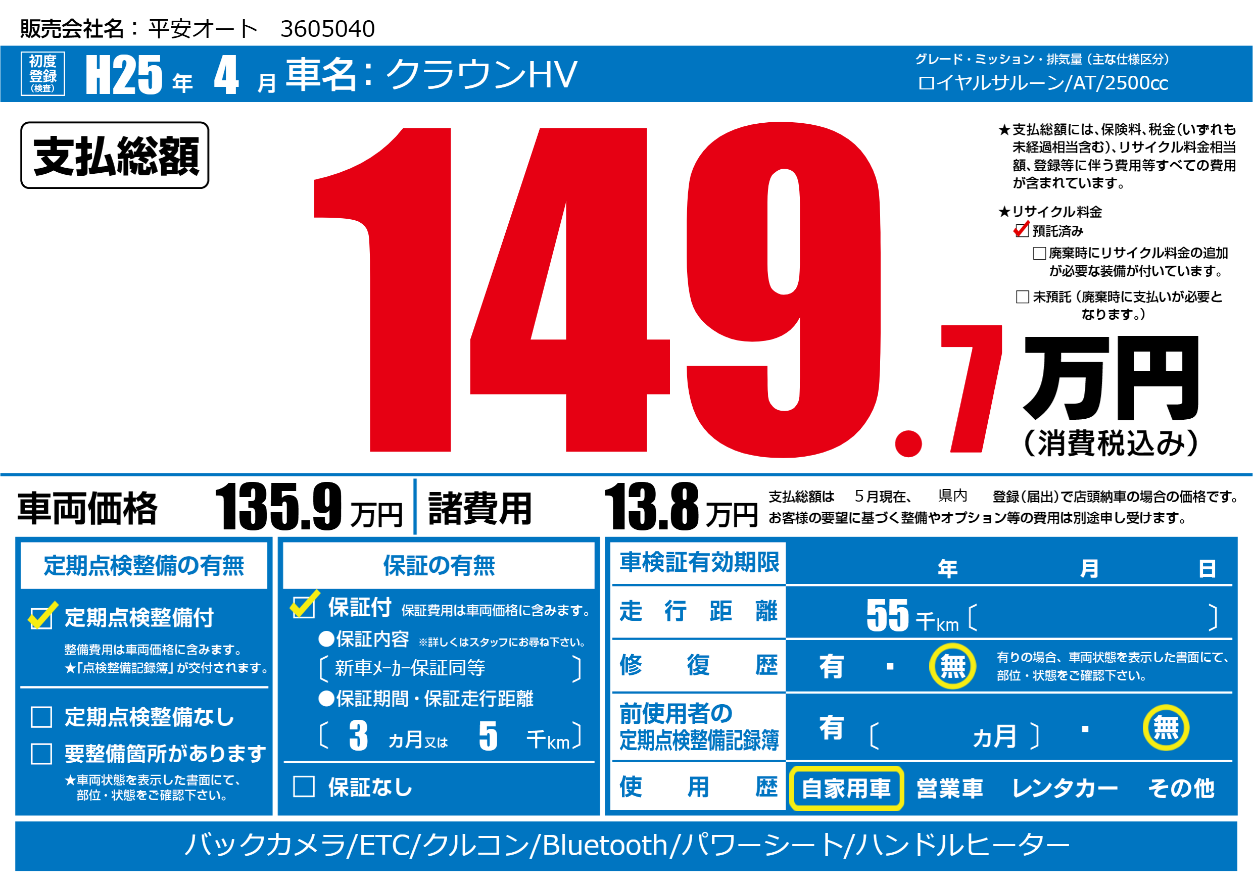 | 車名 | クラウンHV | グレード ミッション 排気量 |