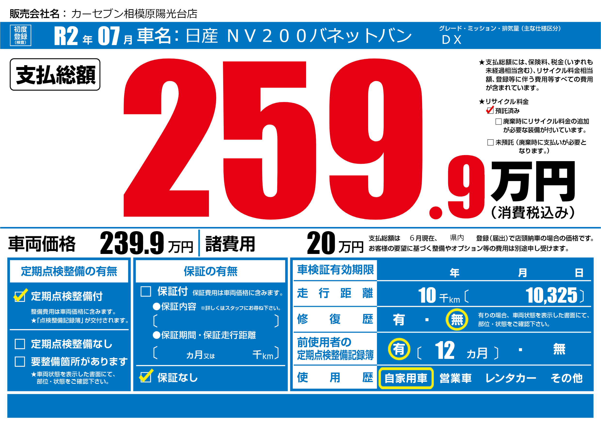 | 車名 | 日産 NV200バネットバン | グレード ミッション 排気量 |