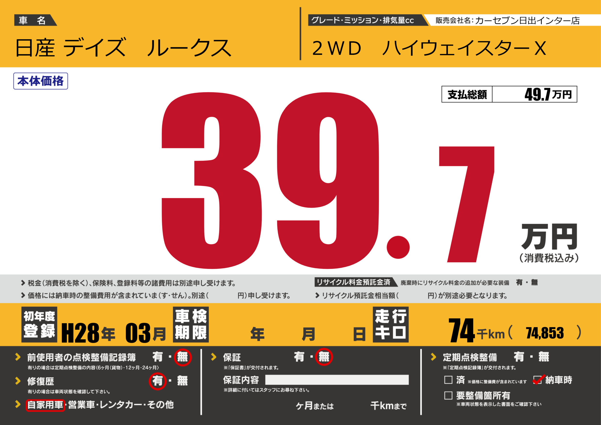 | 車名 | 日産 デイズ ルークス | グレード ミッション 排気量 |