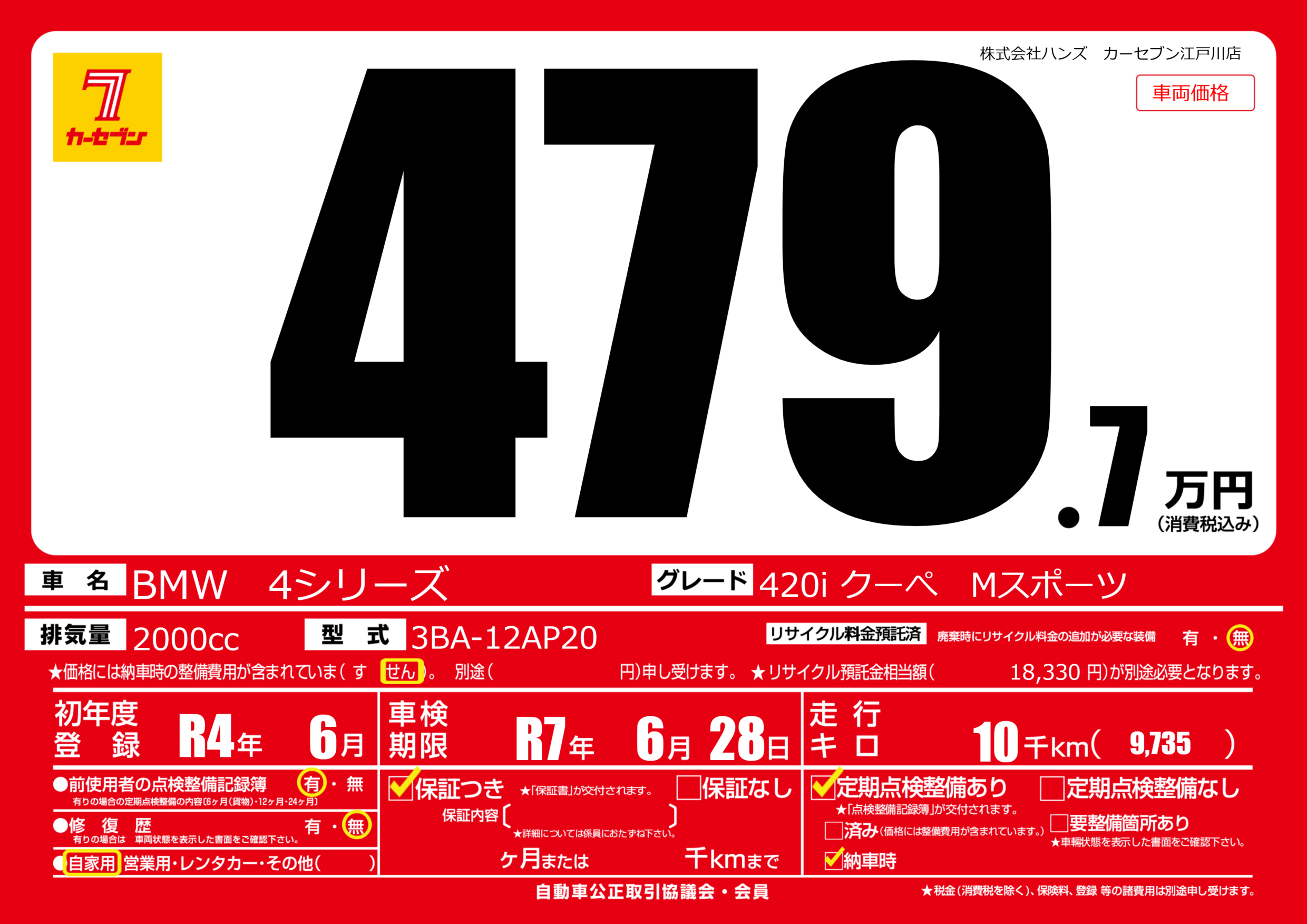 | 車名 | BMW 4シリーズ | グレード ミッション 排気量 |