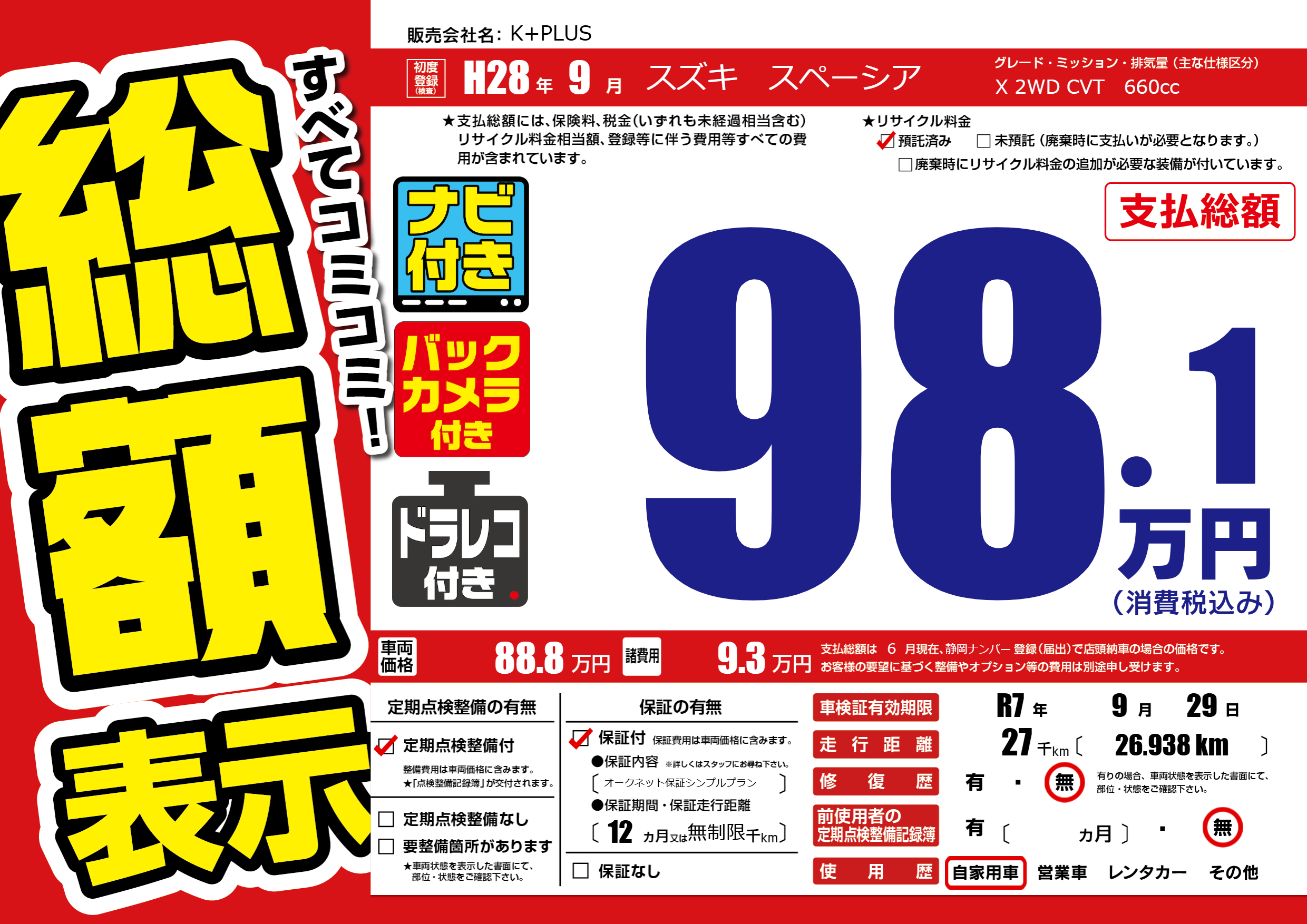 | 走行キロ | 2.7万km | 初年度登録 | H28年9月 |