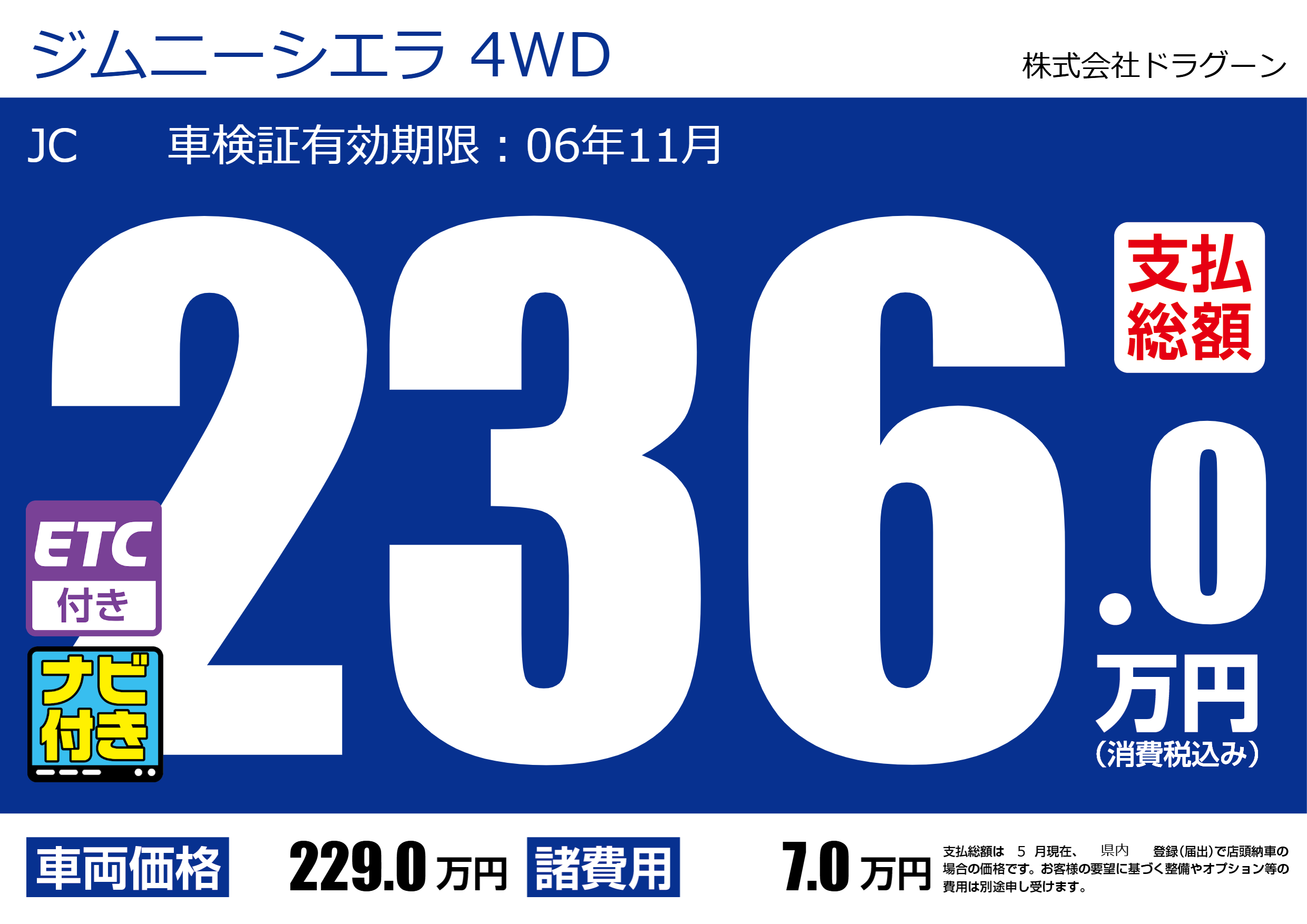 | 車名 | ジムニーシエラ 4WD | グレード ミッション 排気量 |