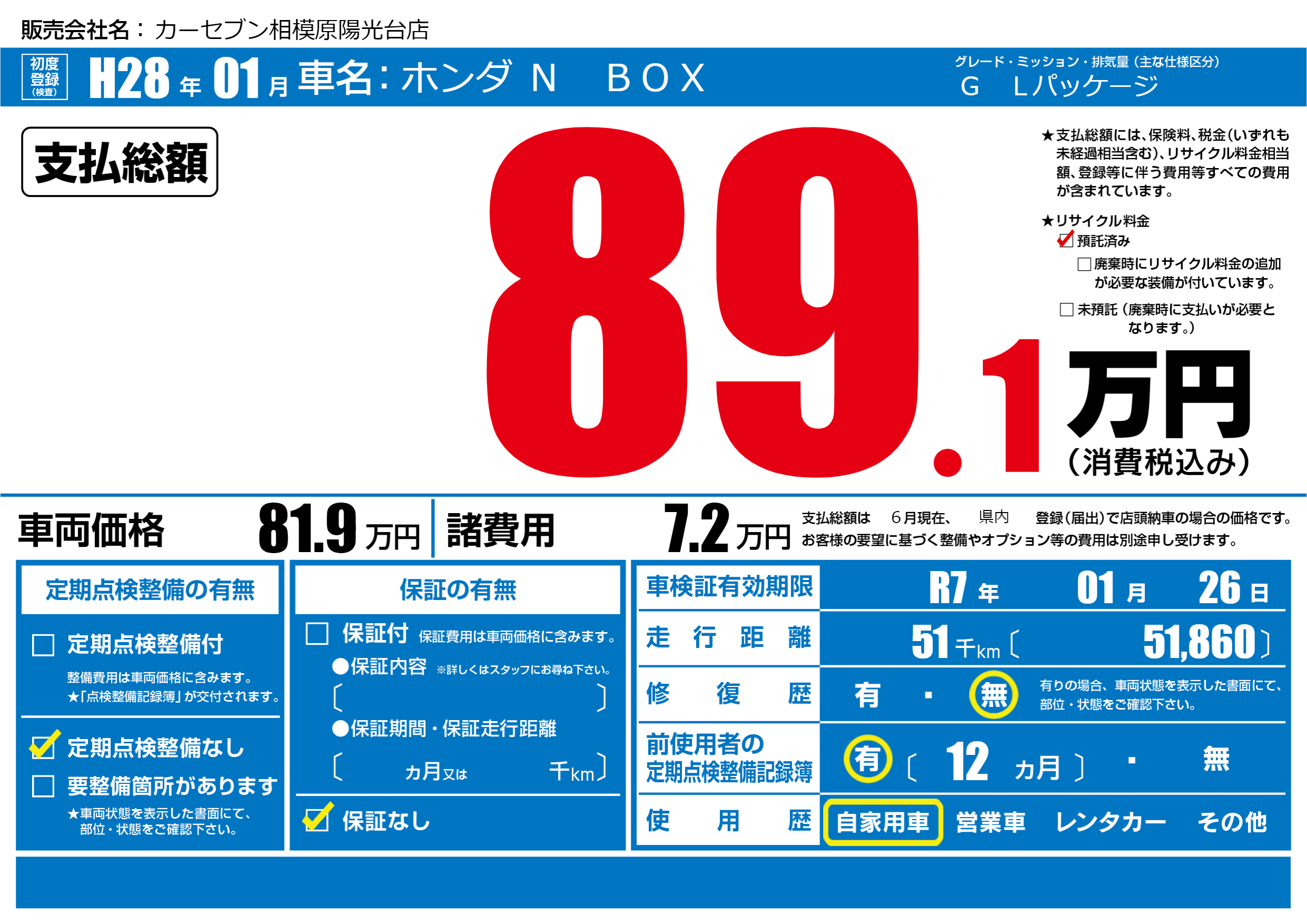 | 車名 | ホンダ N BOX | グレード ミッション 排気量 |