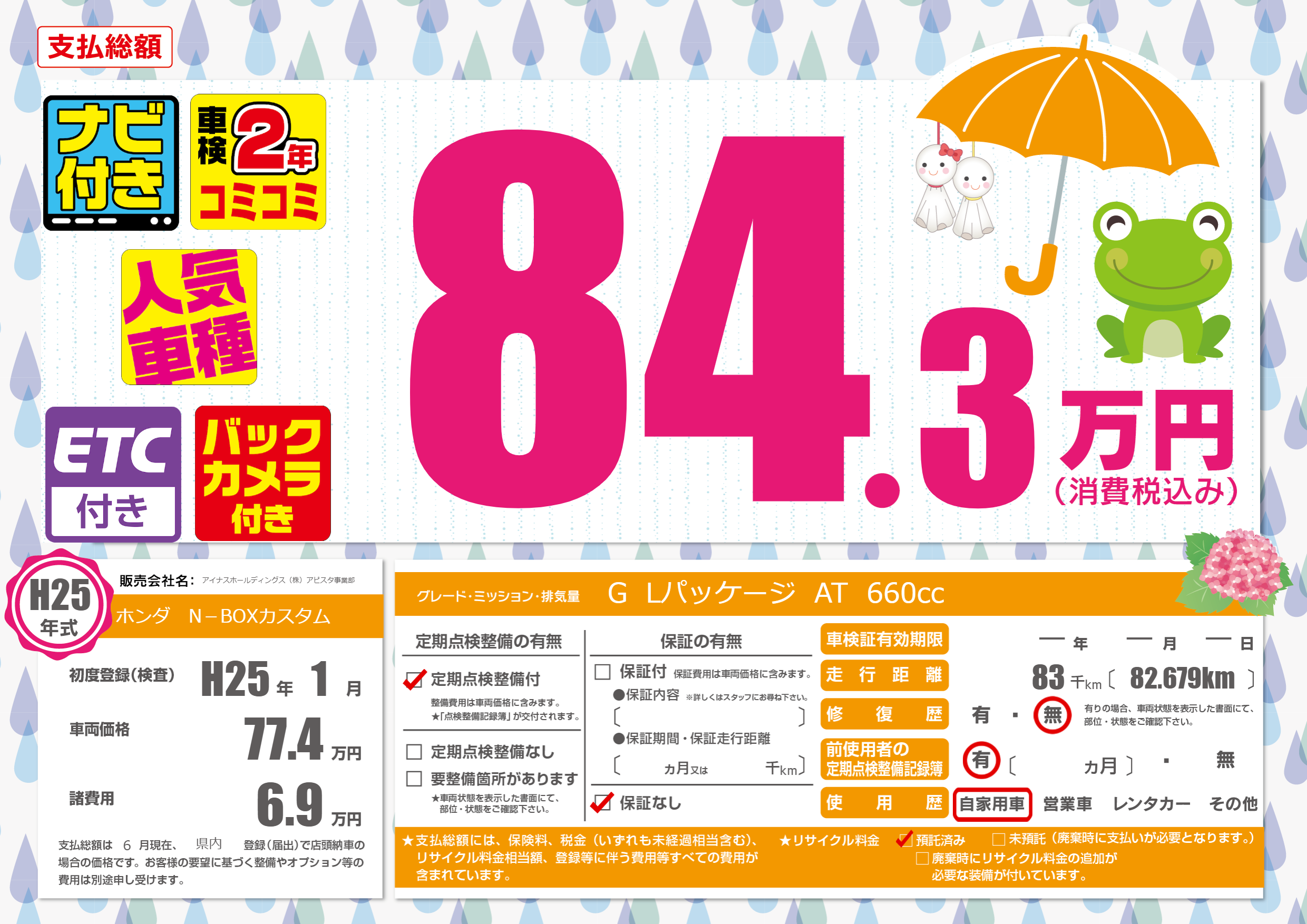 | 車名 | ホンダ N-BOXカスタム | グレード ミッション 排気量 |