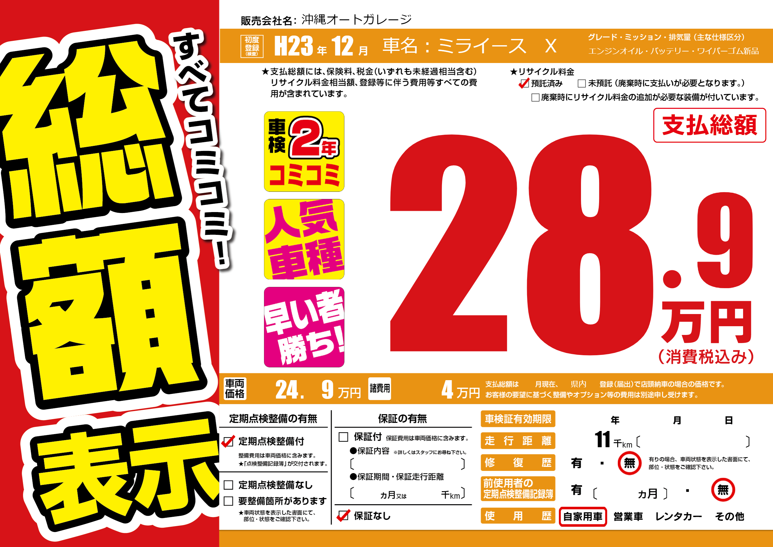 | 走行キロ | 1.1万km | 初年度登録 | H23年12月 |
