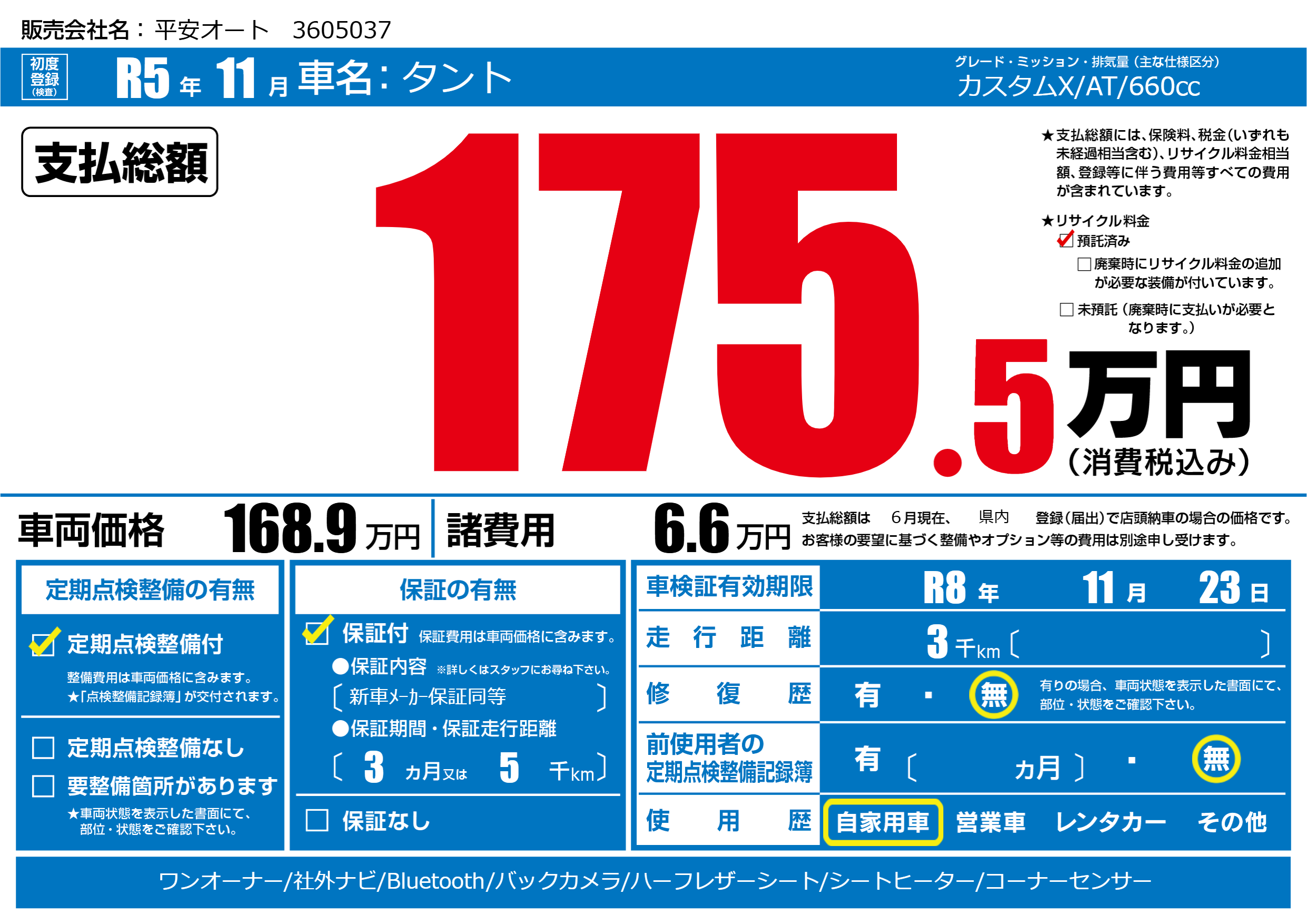 | 走行キロ | 0.3万km | 初年度登録 | R5年11月 |