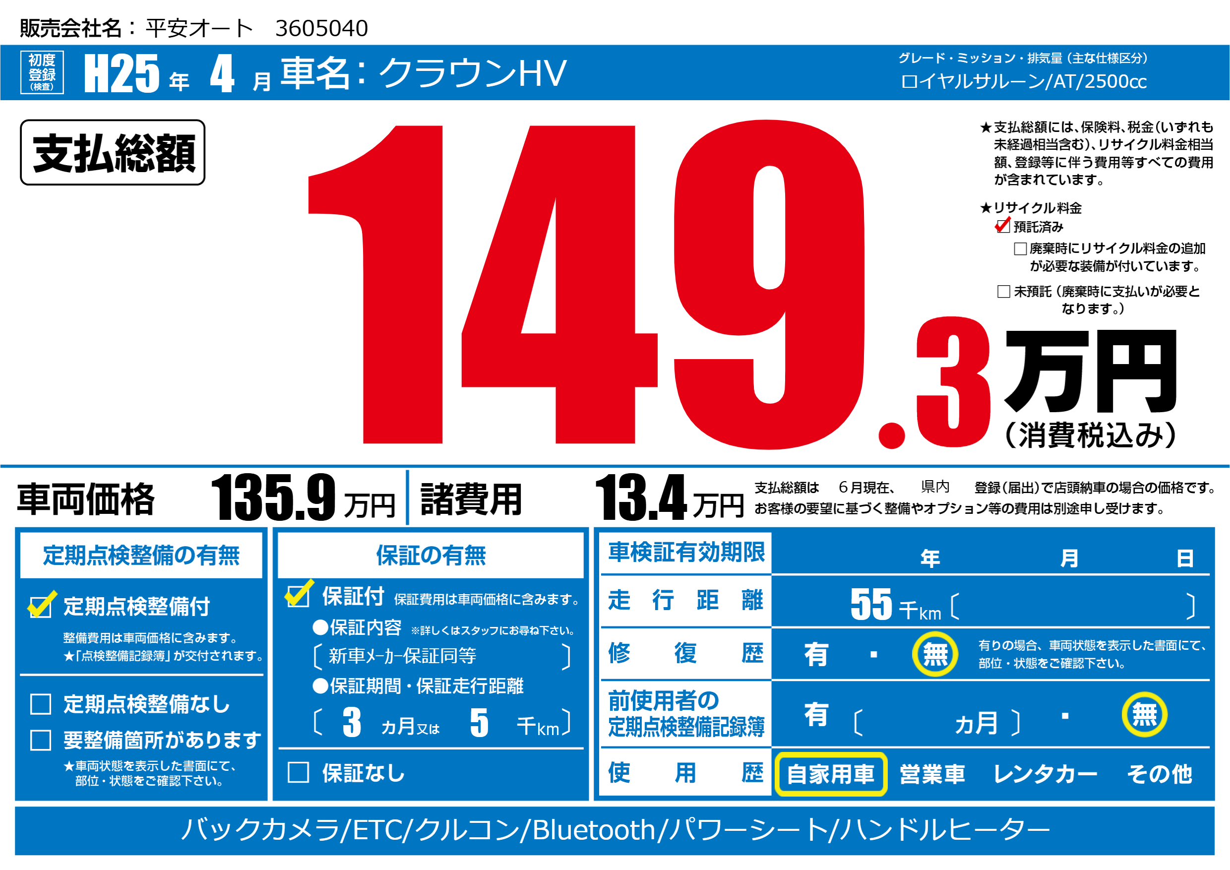 | 車名 | クラウンHV | グレード ミッション 排気量 |