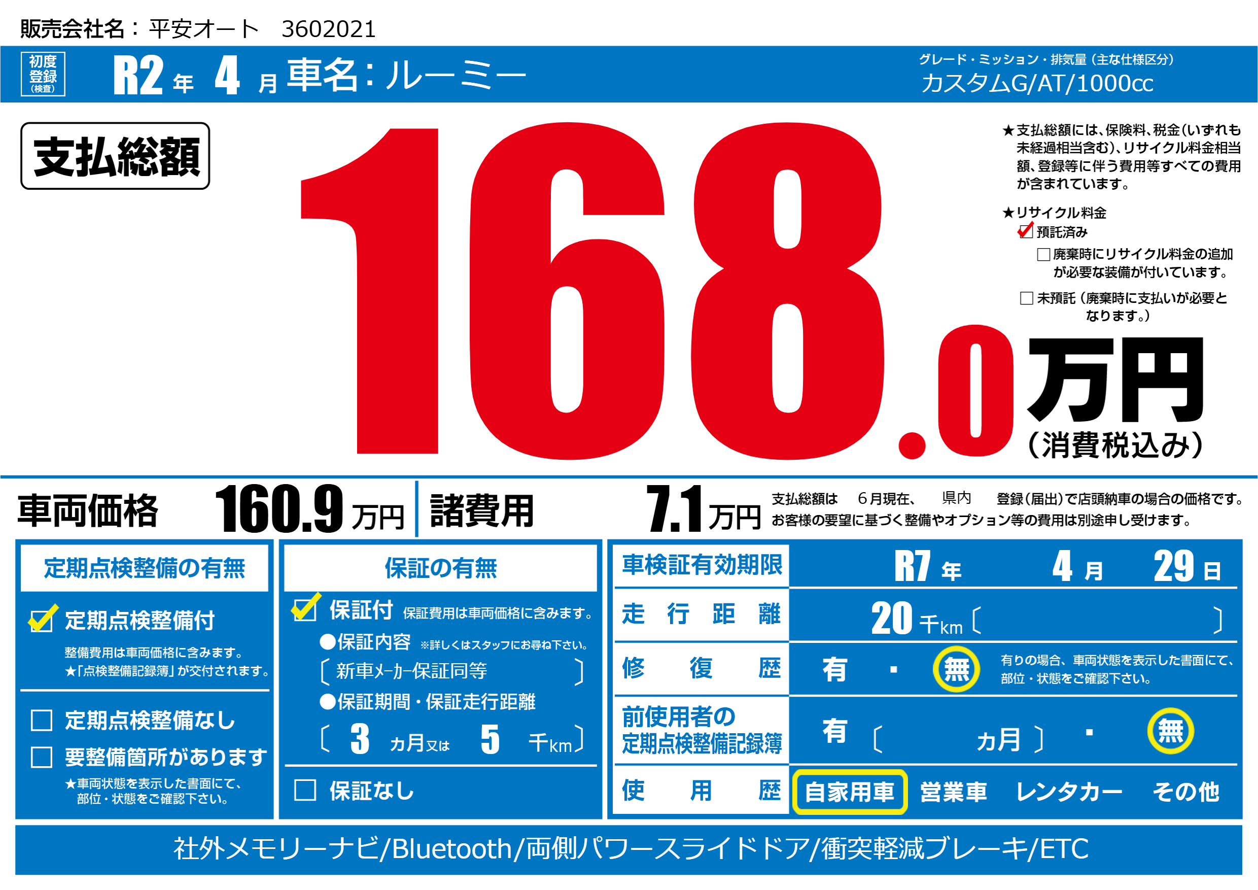 | 車名 | ルーミー | グレード ミッション 排気量 |