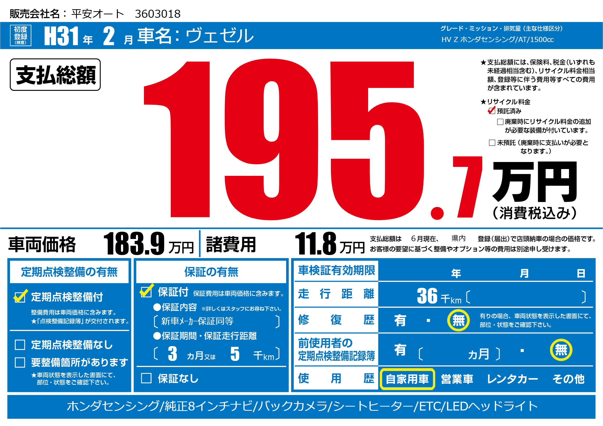 | 車名 | ヴェゼル | グレード ミッション 排気量 |