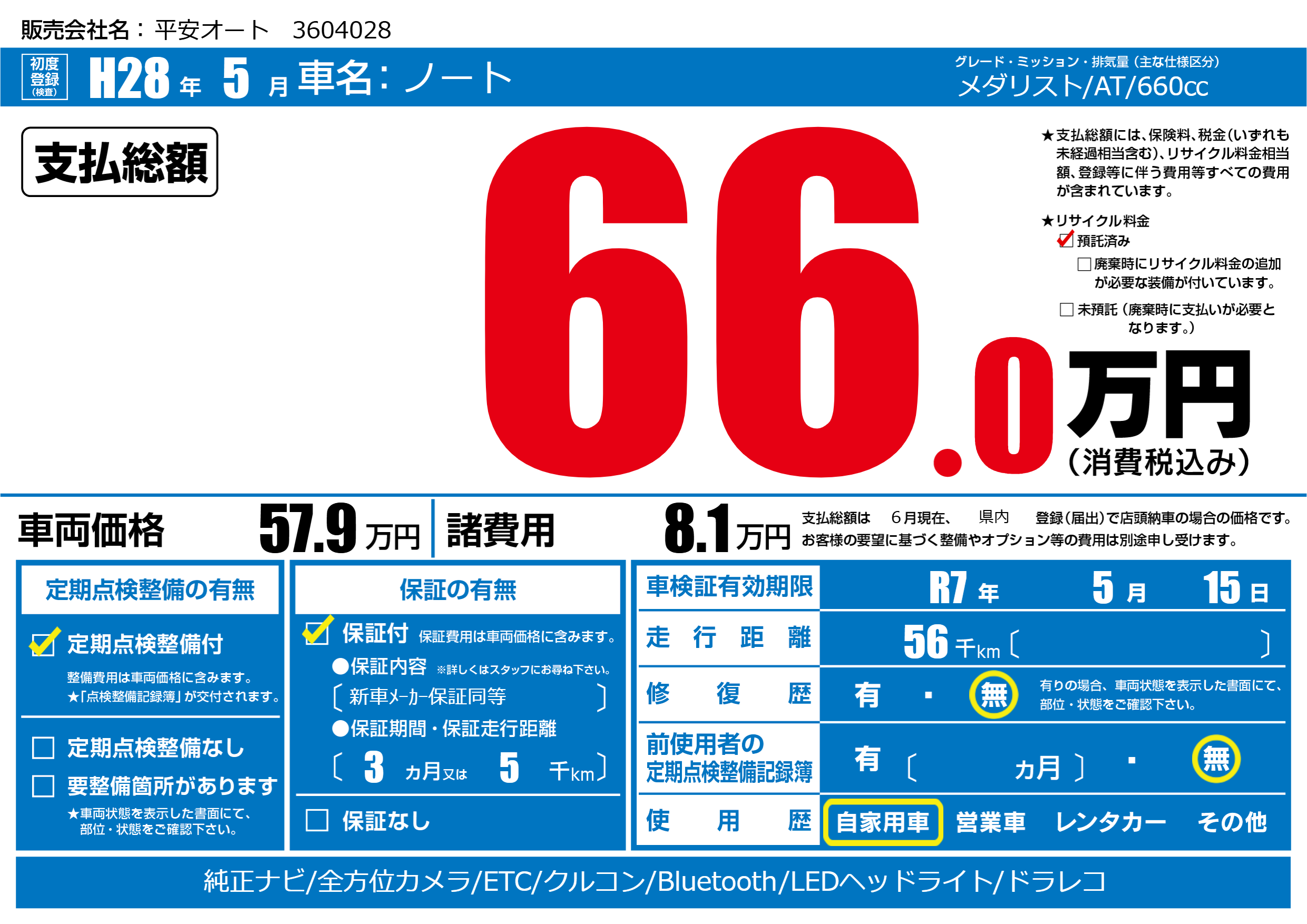 | 走行キロ | 5.6万km | 初年度登録 | H28年5月 |