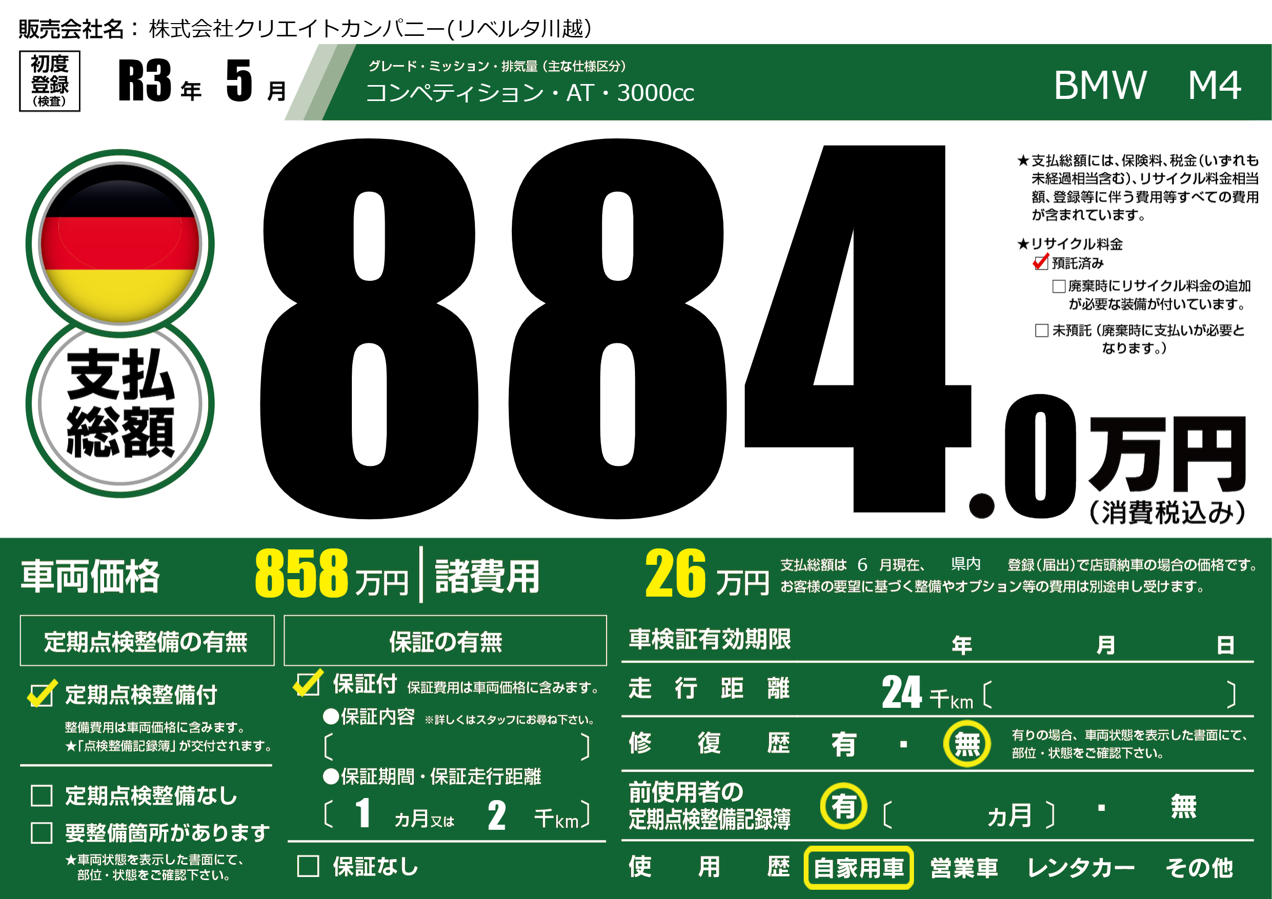 | 車名 | BMW M4 | グレード ミッション 排気量 |