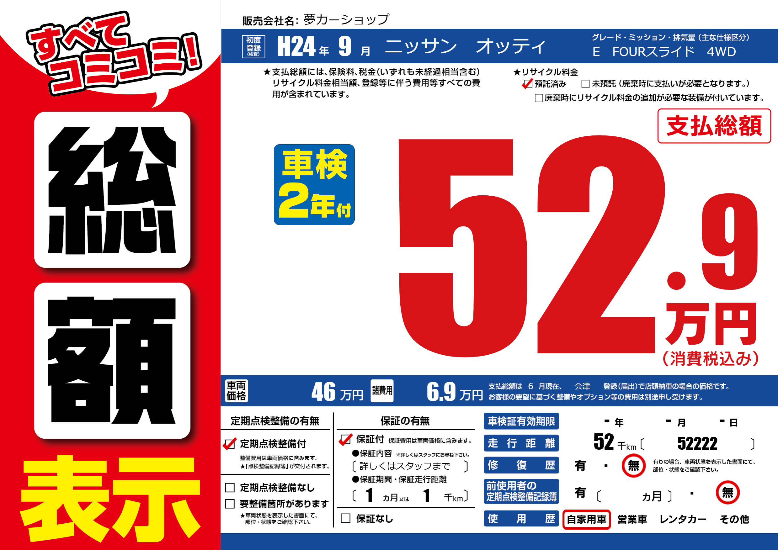 | 車名 | ニッサン オッティ | グレード ミッション 排気量 |
