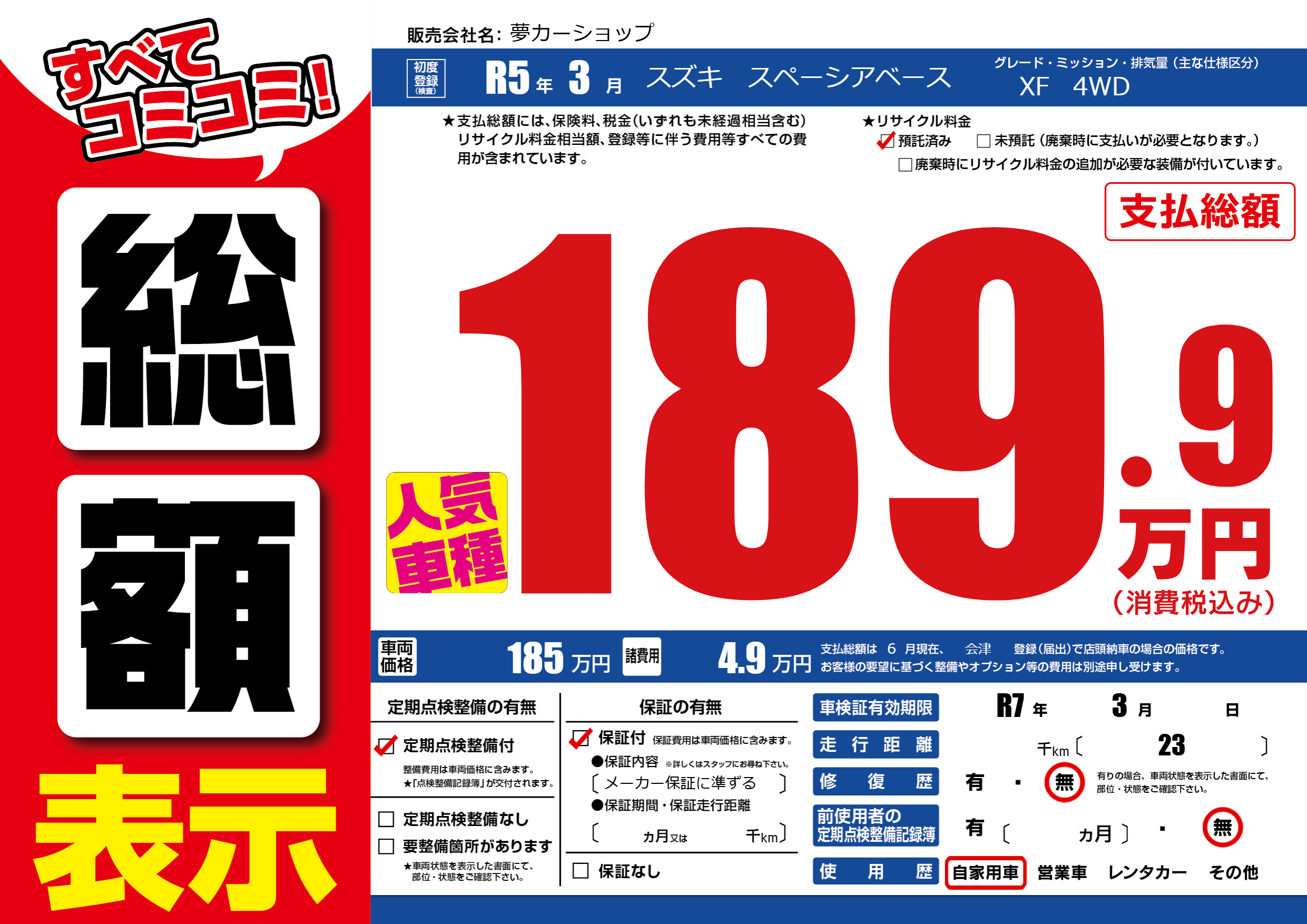 なし | 車検制限 | R7年3月---月 |