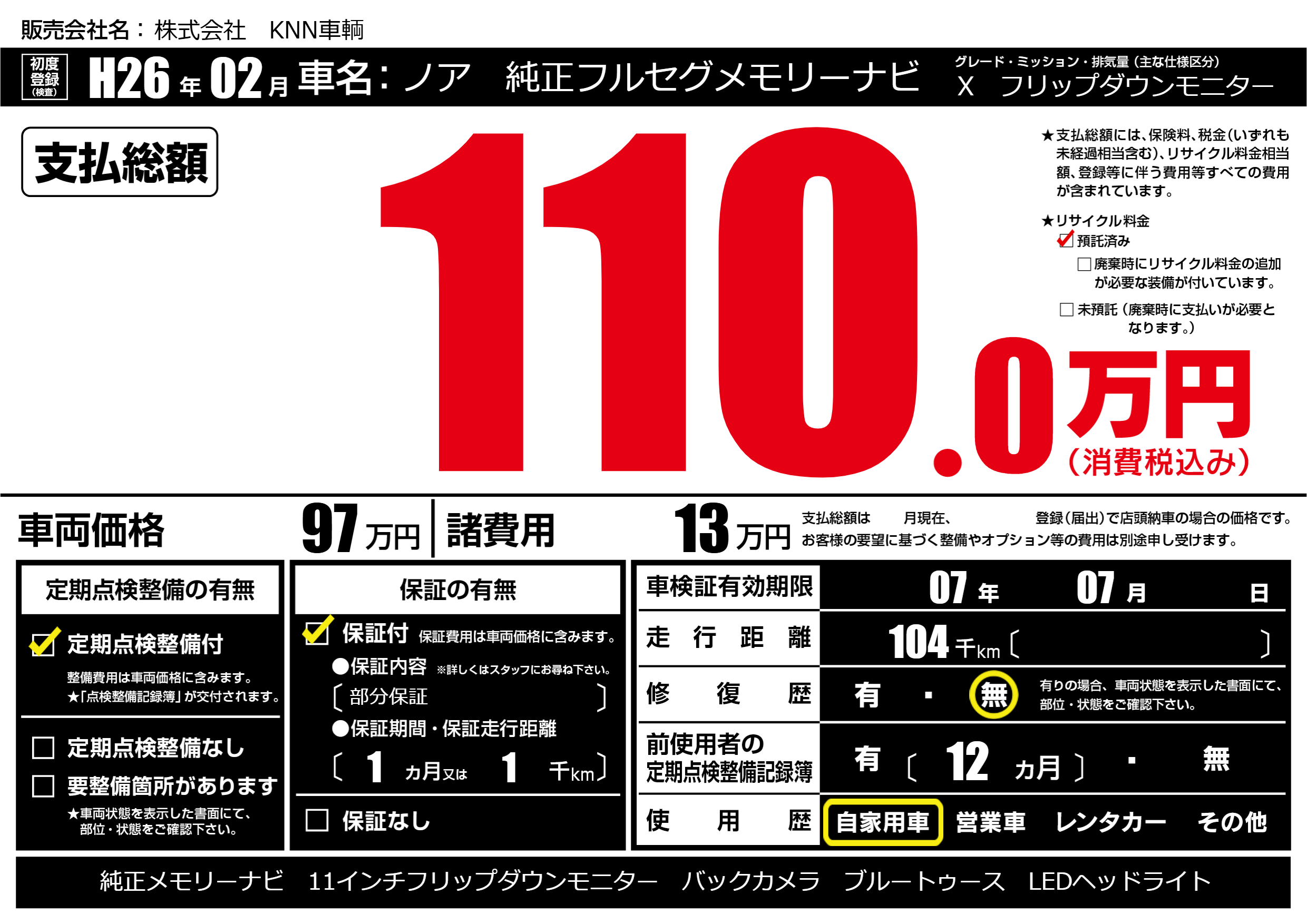| 車名 | ノア 純正フルセグメモリーナビ | グレード ミッション 排気量 |