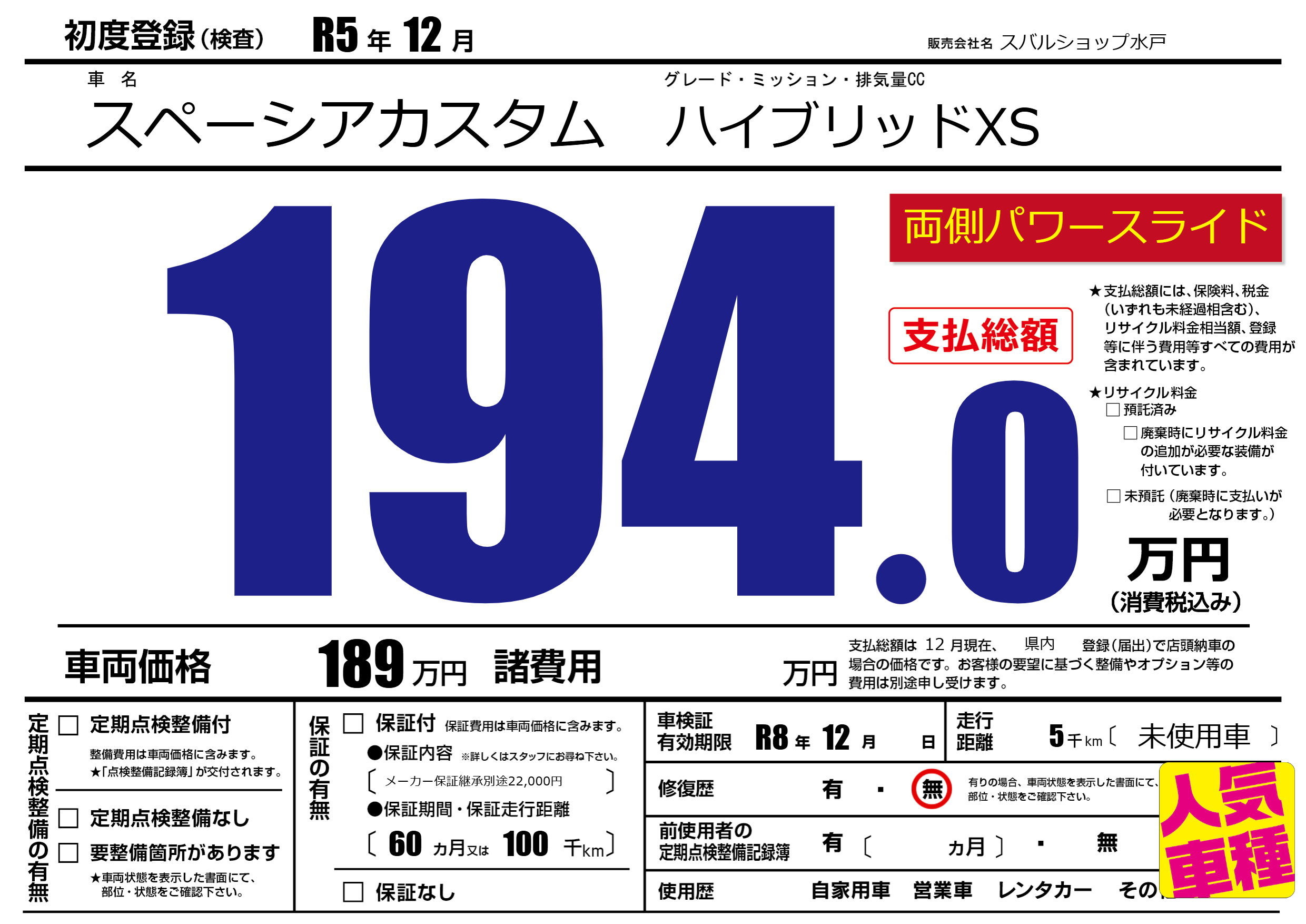 | 車名 | スペーシアカスタム | グレード ミッション 排気量 |