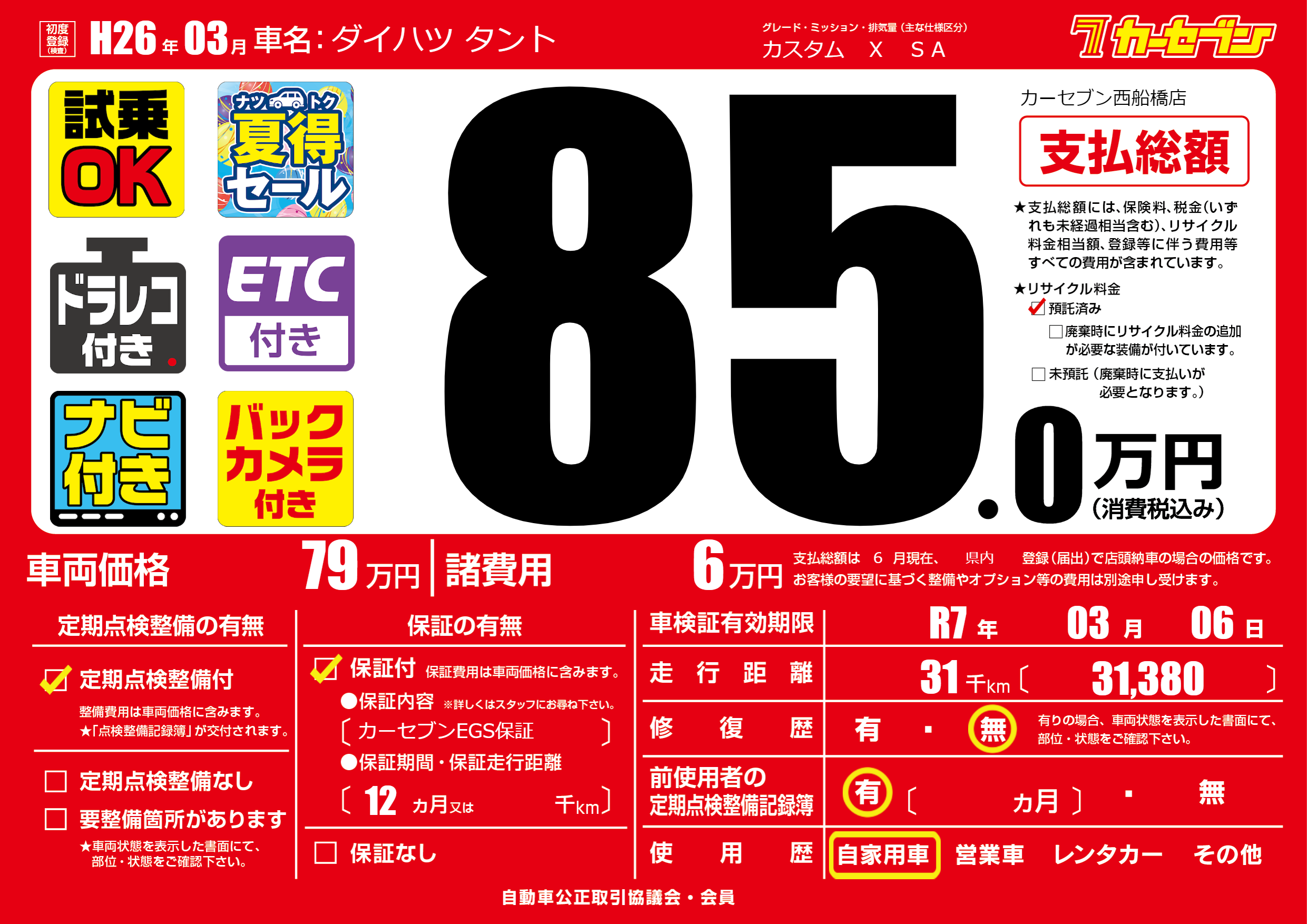 | 走行キロ | 3.1万km | 初年度登録 | H26年03月 |