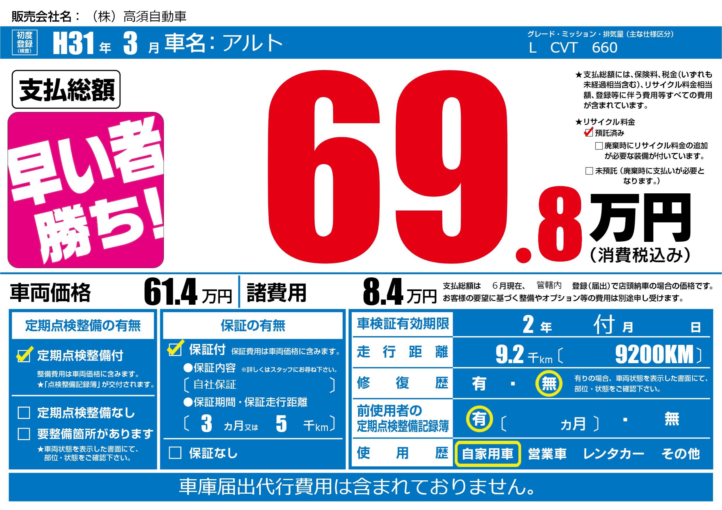 | 走行キロ | 0.9万km | 初年度登録 | H31年3月 |