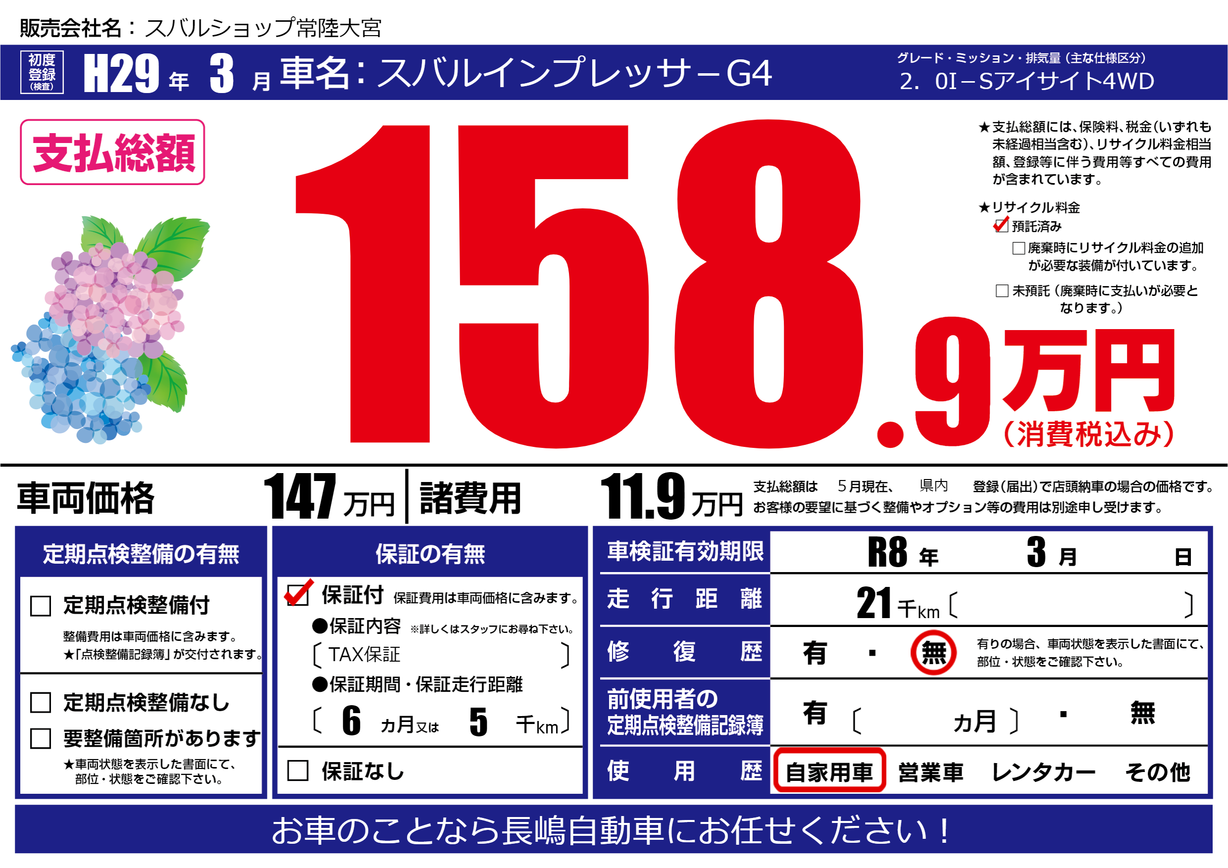 | 車名 | スバルインプレッサ-G4 | グレード ミッション 排気量 |