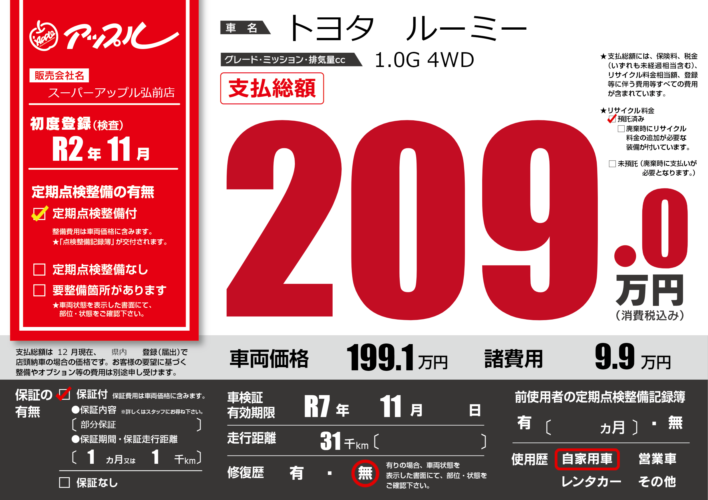 | 車検制限 | R7年 11月 - 日 | ||