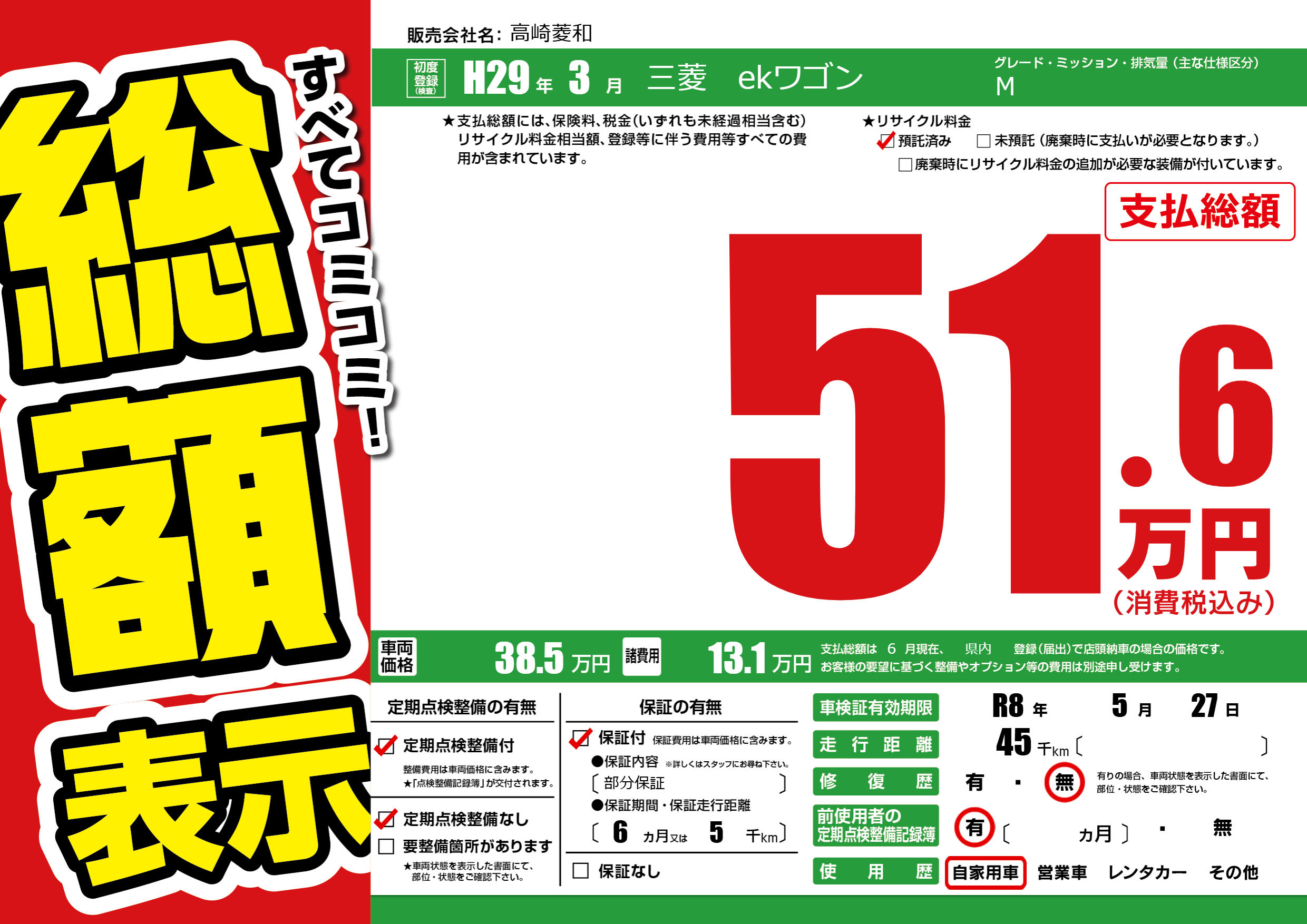 | 車名 | 三菱 ekワゴン | グレード ミッション 排気量 |