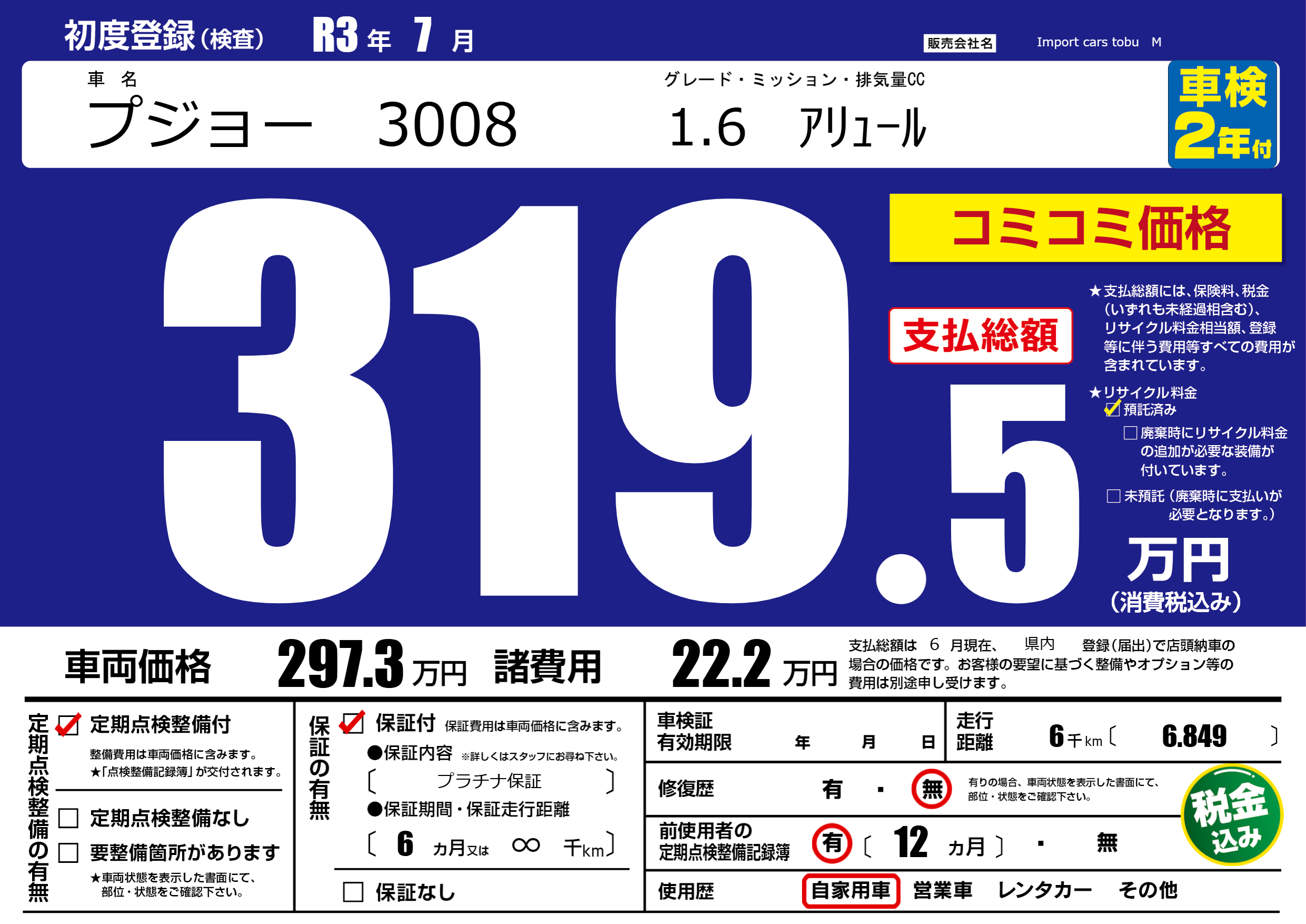 | 車名 | プジョー 3008 | グレード ミッション 排気量 |