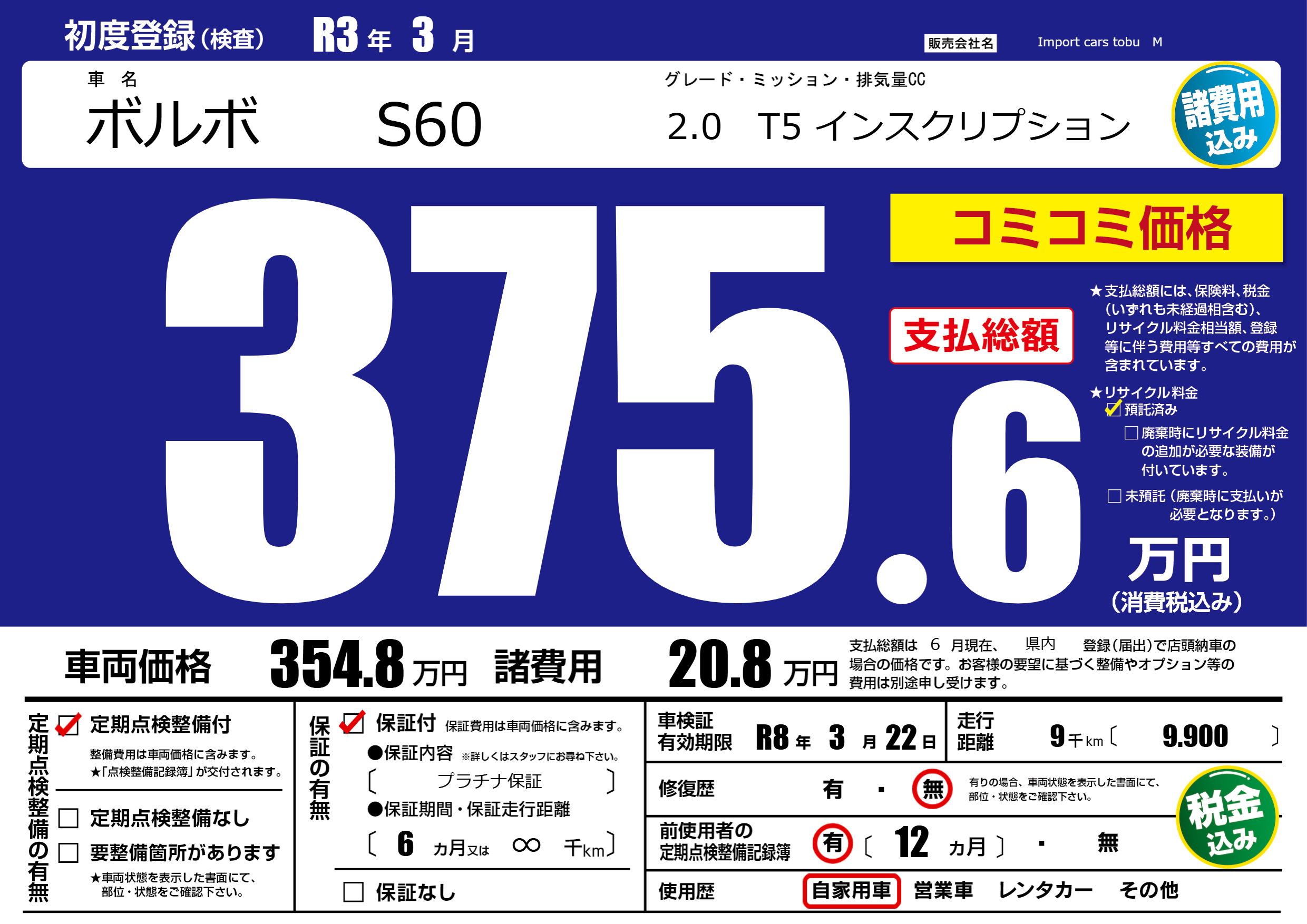 | 車名 | ボルボ S60 | グレード ミッション 排気量 |
