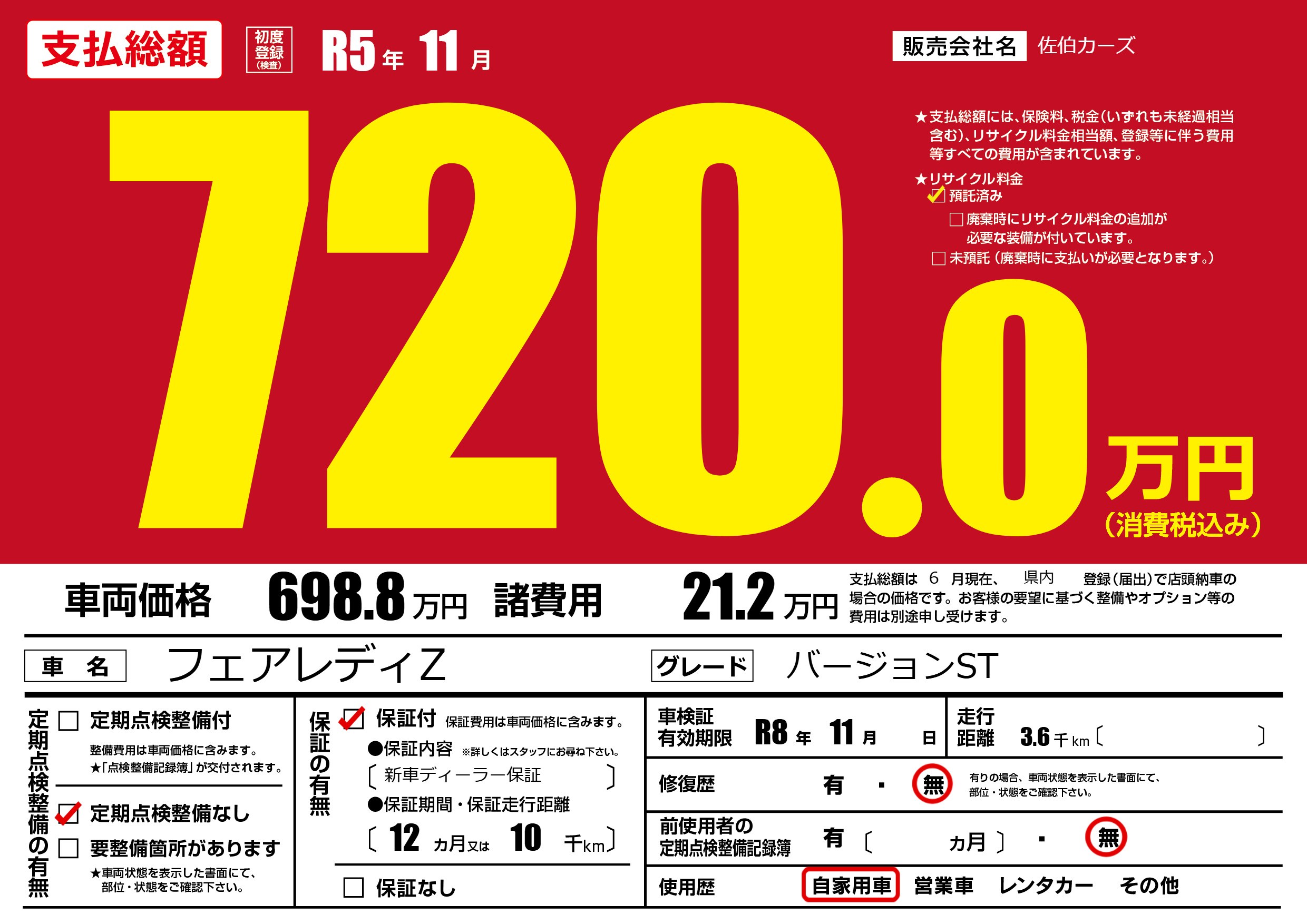 | 走行キロ | 0.3万km | 初年度登録 | R5年11月 |