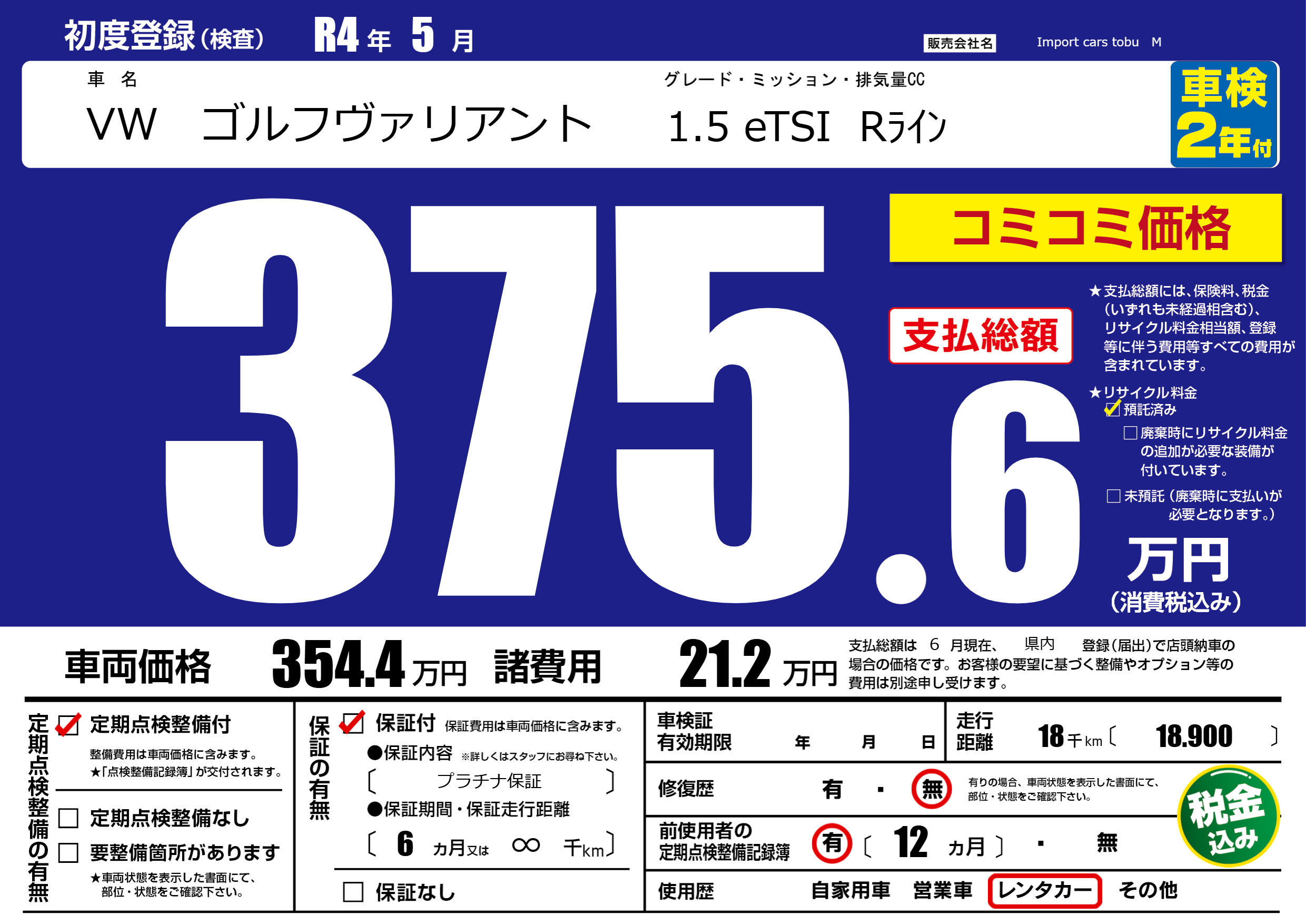 | 車名 | VW ゴルフヴァリアント | グレード ミッション 排気量 |