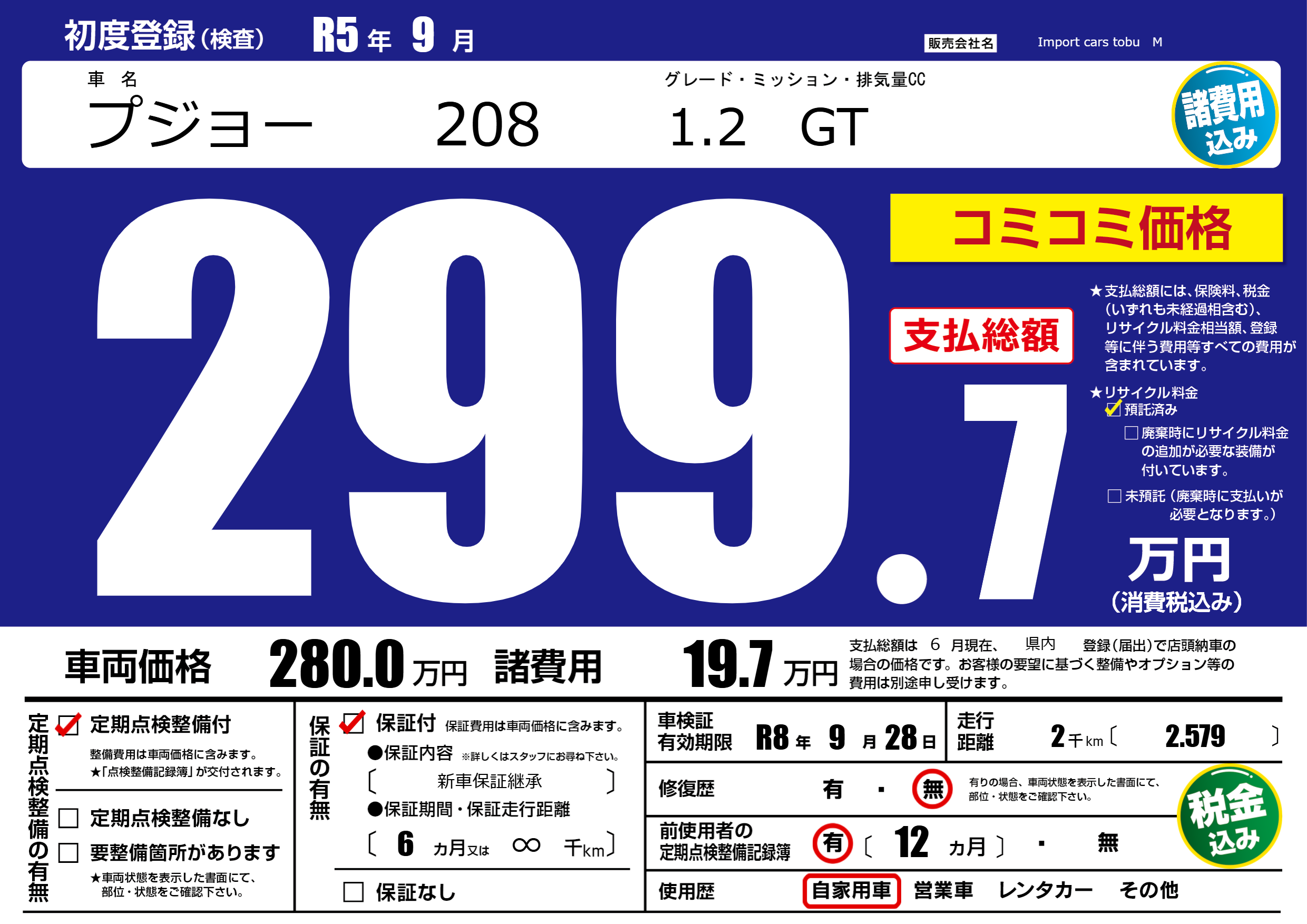 | 車名 | プジョー 208 | グレード ミッション 排気量 |