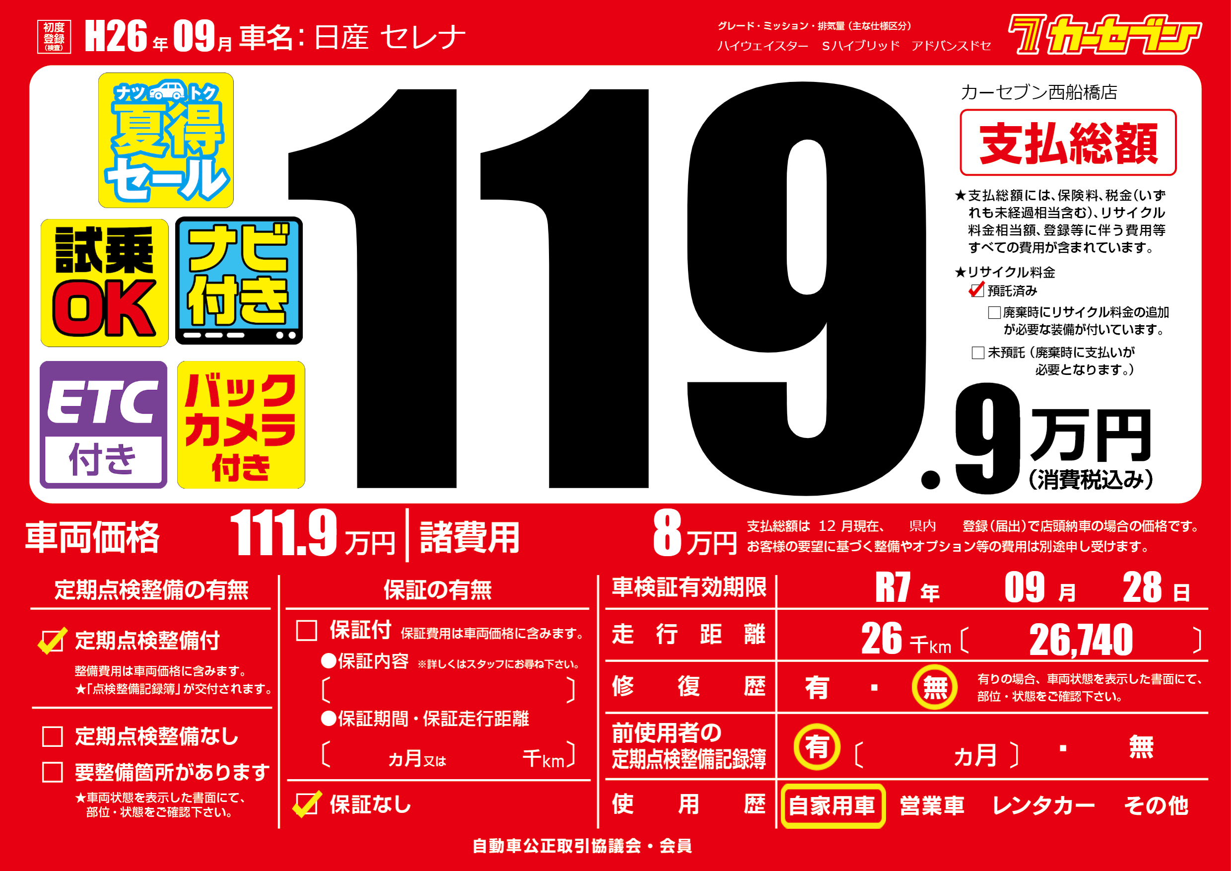 | 車検制限 | R7年 09月 28日 | ||
