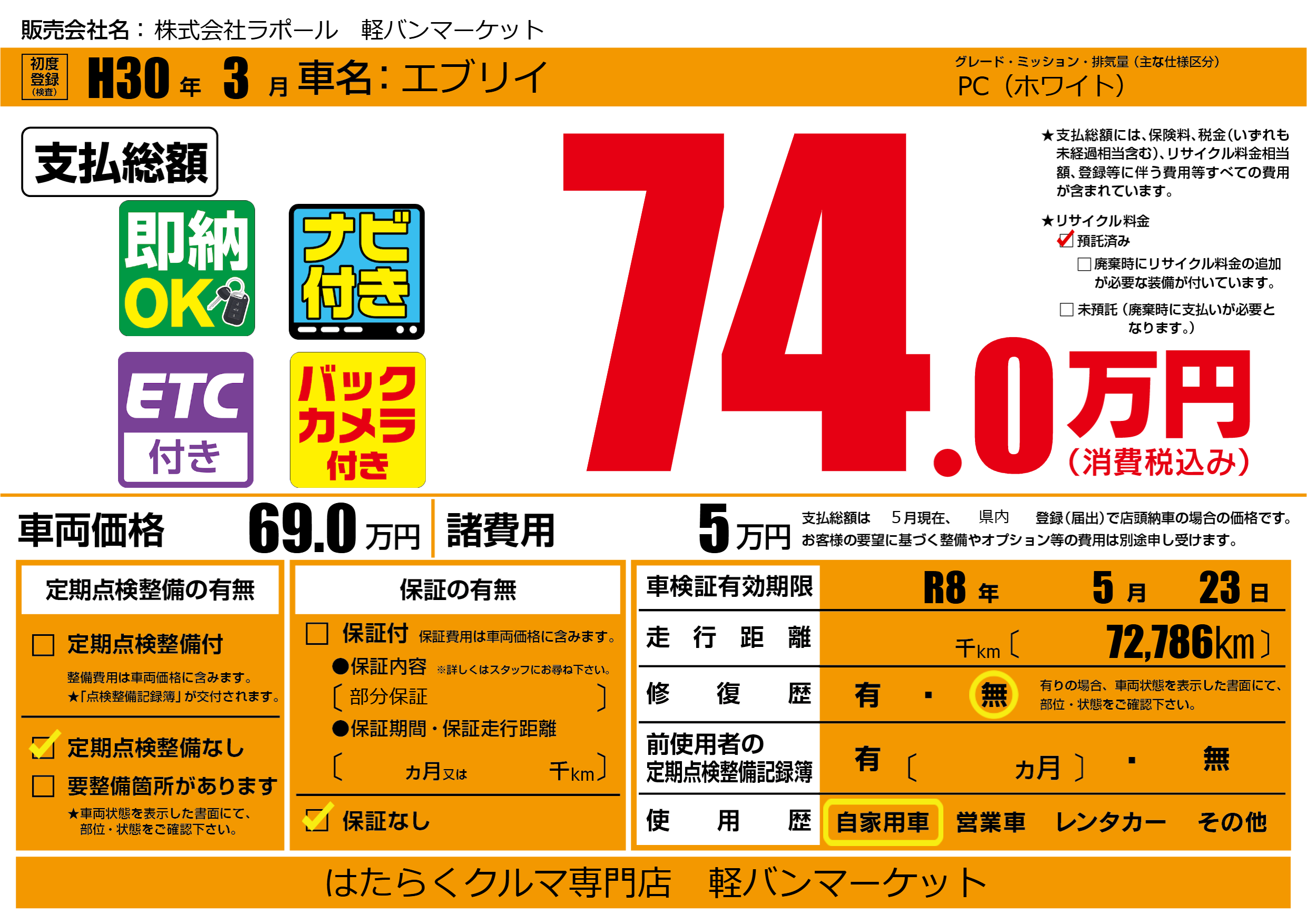 | 走行キロ | - | 初年度登録 | H30年3月 |
