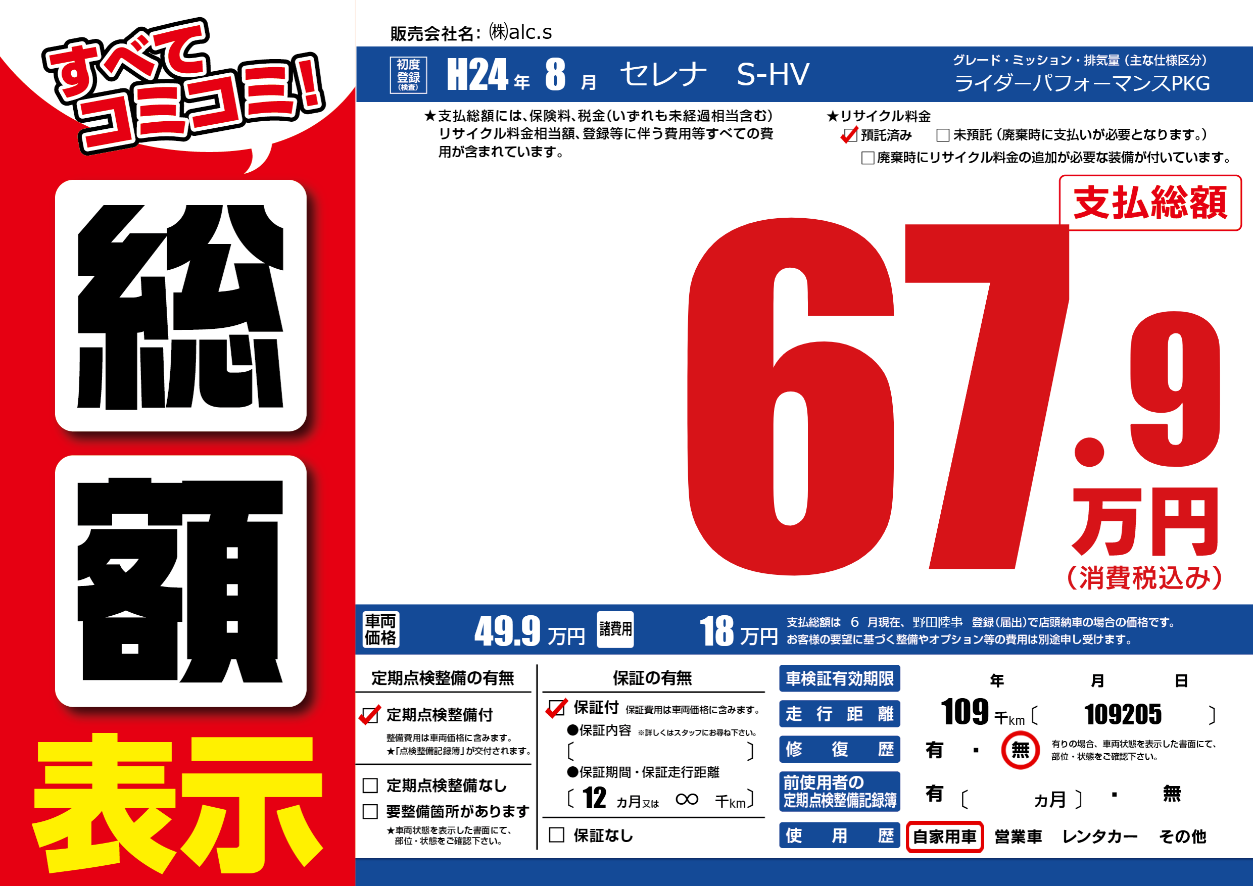 | 走行キロ | 10.9万km | 初年度登録 | H24年8月 |