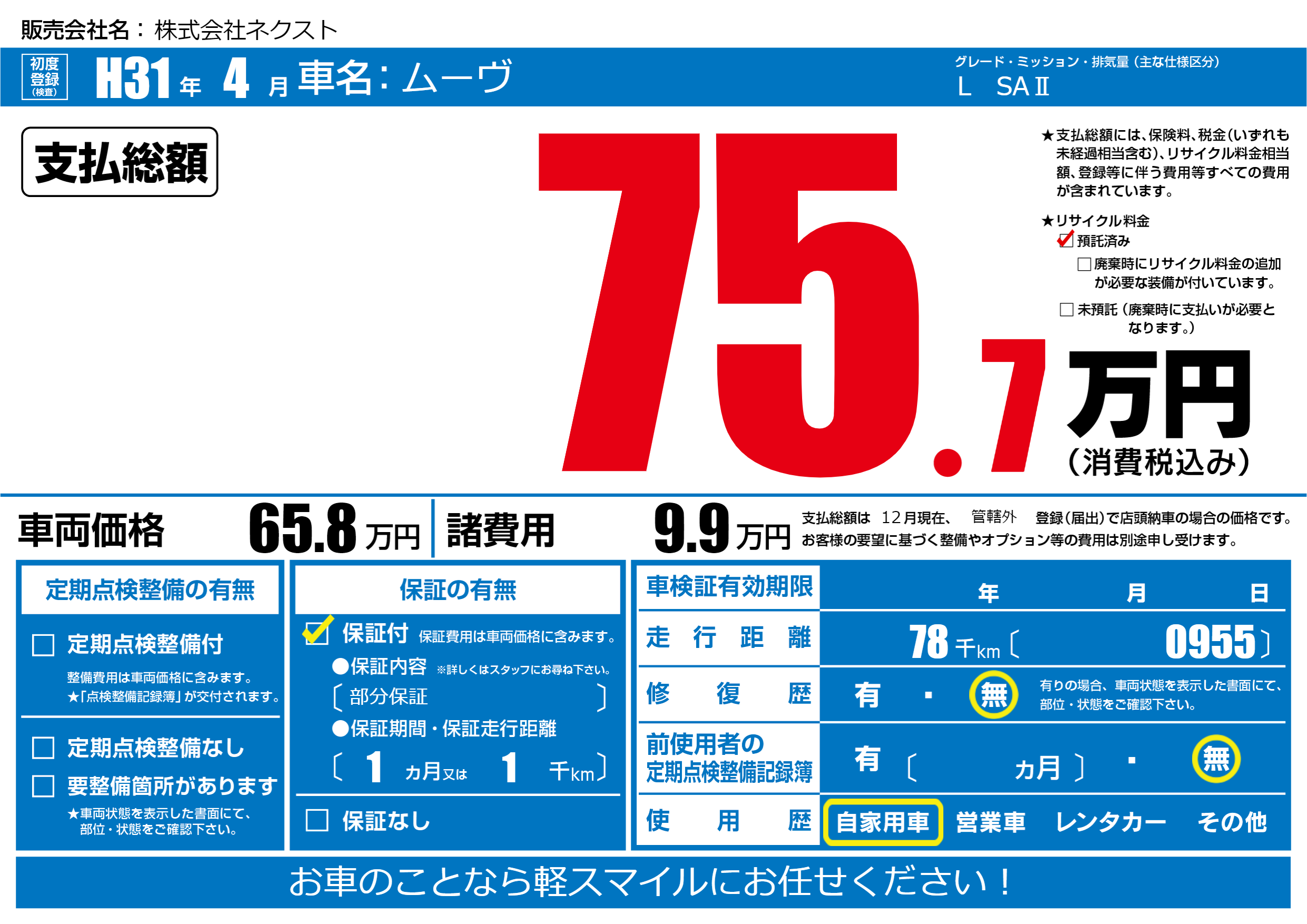 | 車名 | ムーヴ | グレード ミッション 排気量 |