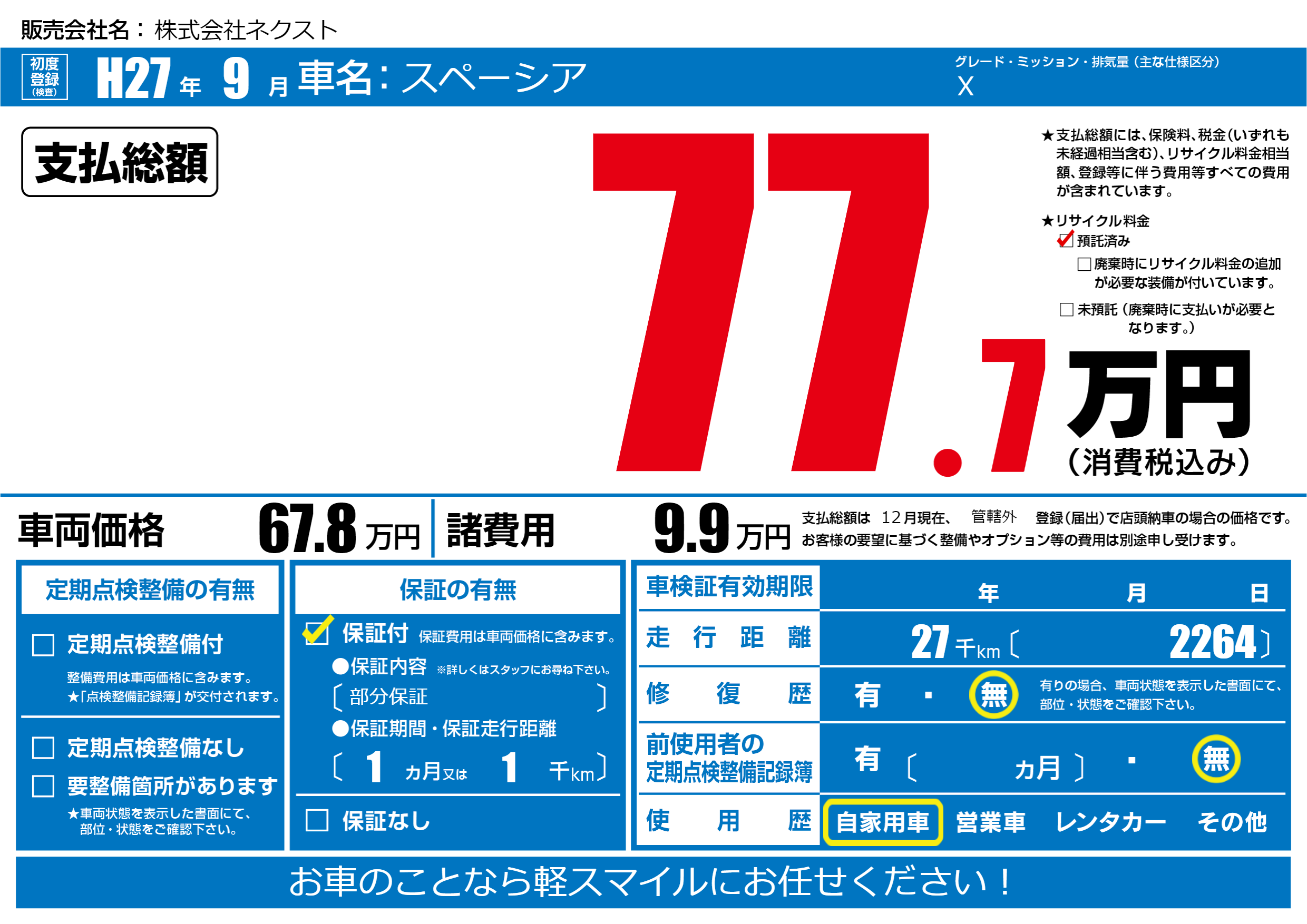 | 車名 | スペーシア | グレード ミッション 排気量 |