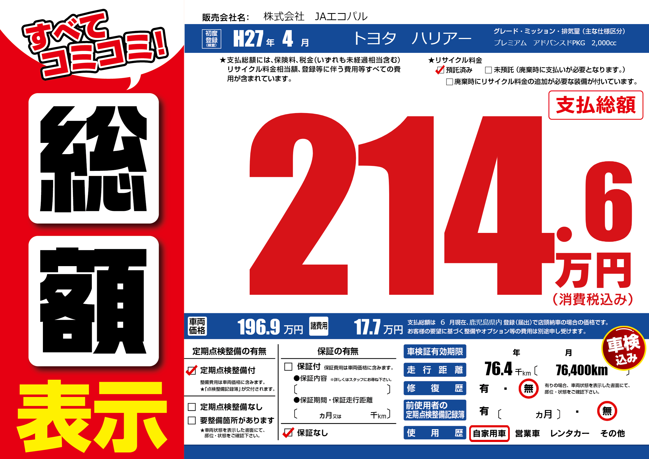 | 走行キロ | 7.6万km | 初年度登録 | H27年4月 |