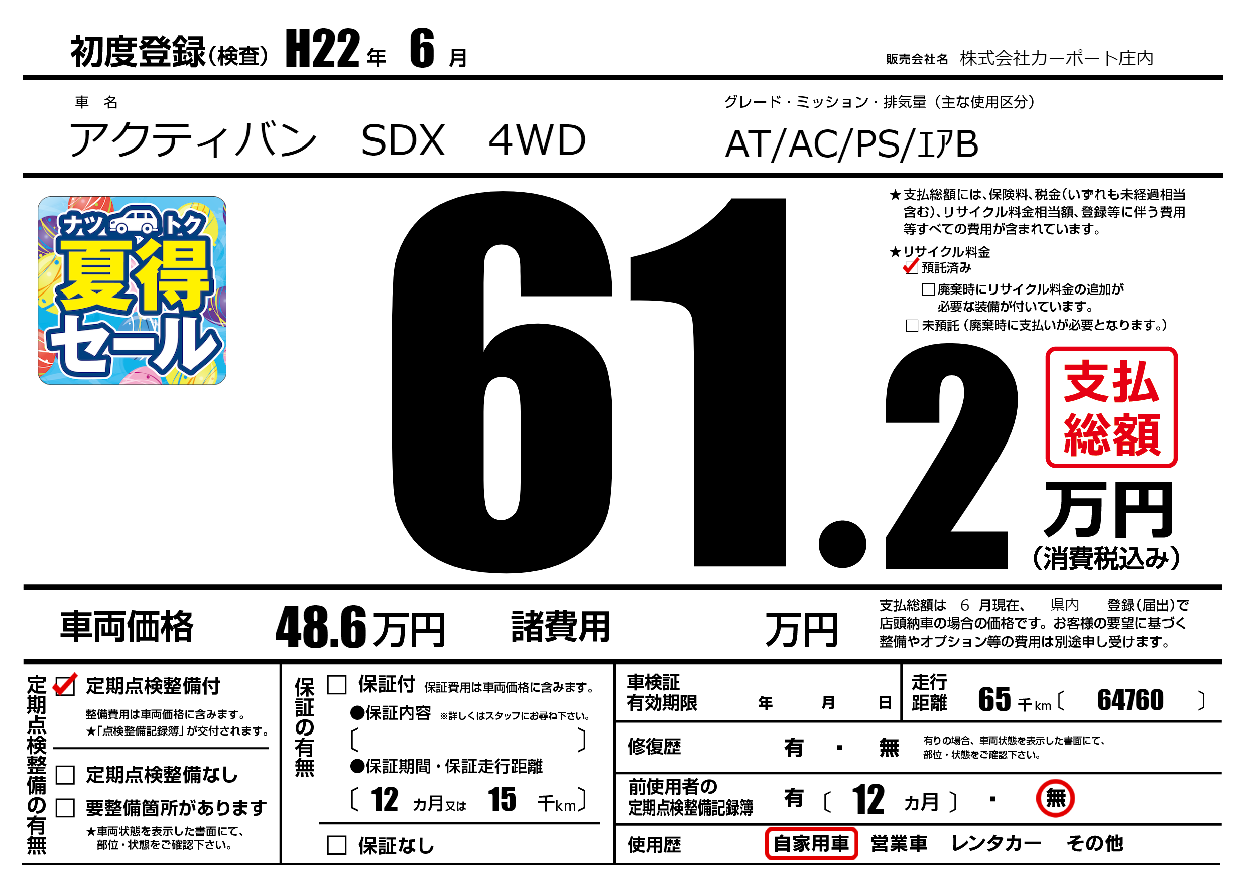 | 走行キロ | 6.5万km | 初年度登録 | H22年6月 |