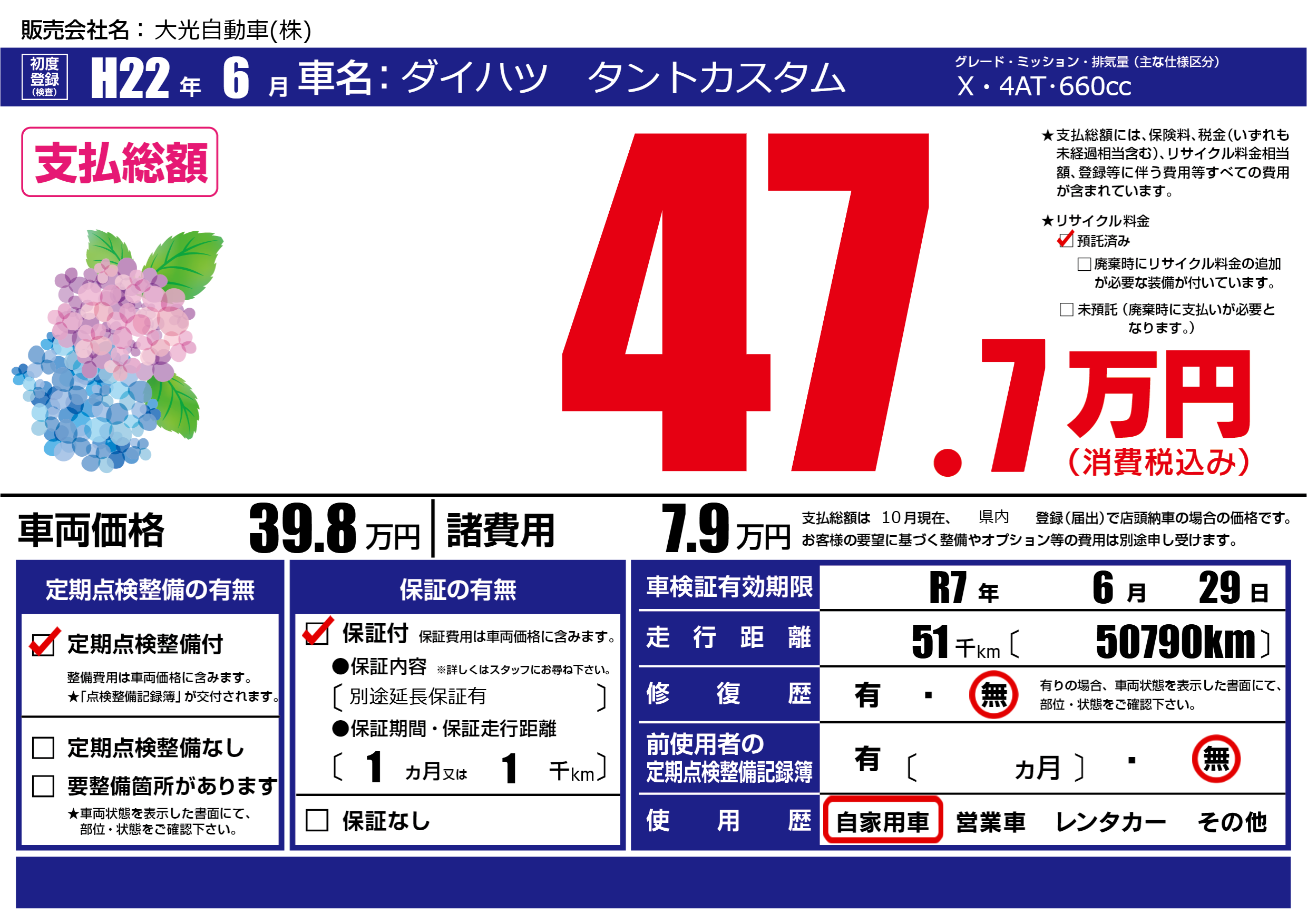 | 走行キロ | 5.1万km | 初年度登録 | H22年6月 |