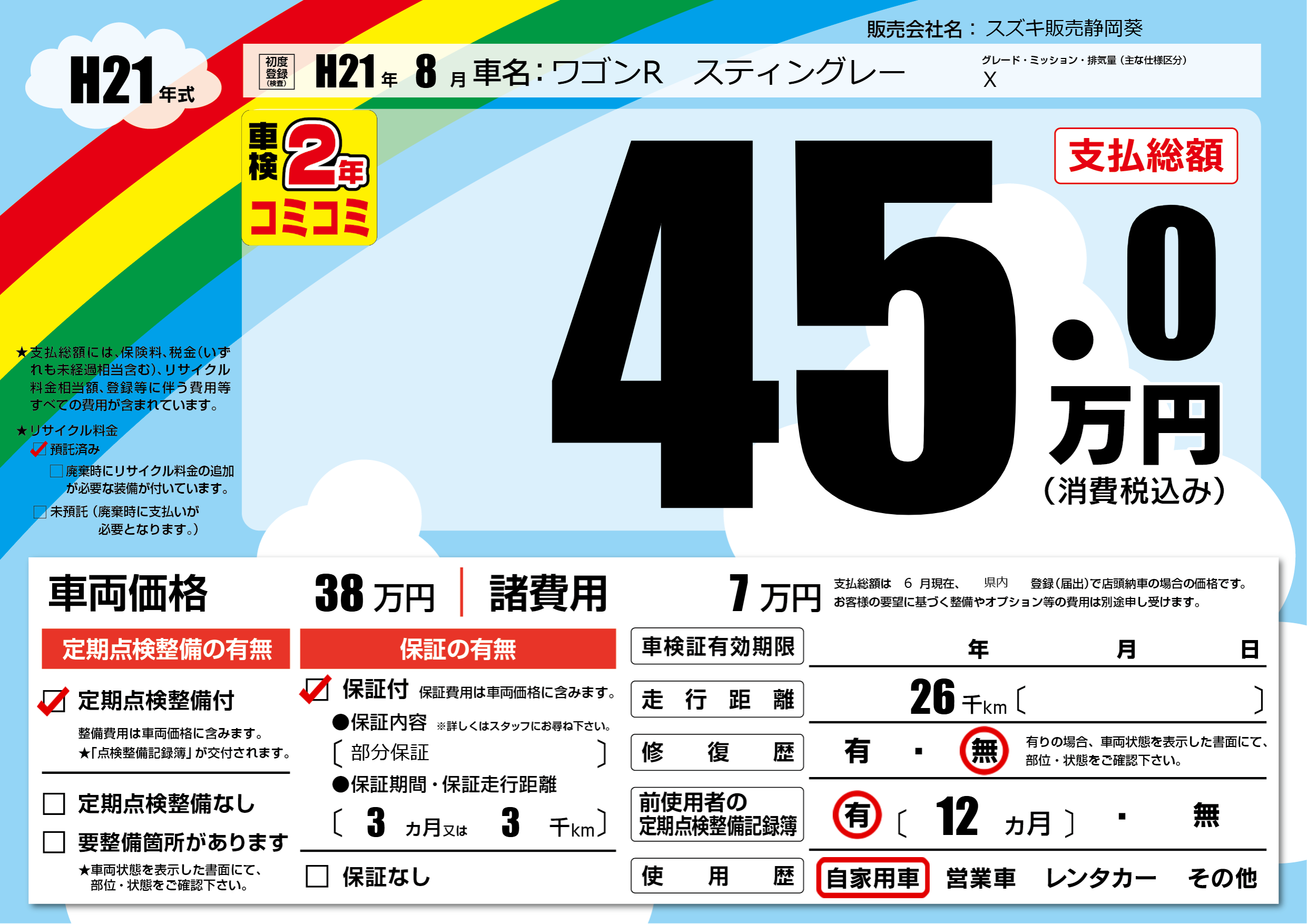 | 走行キロ | 2.6万km | 初年度登録 | H21年8月 |