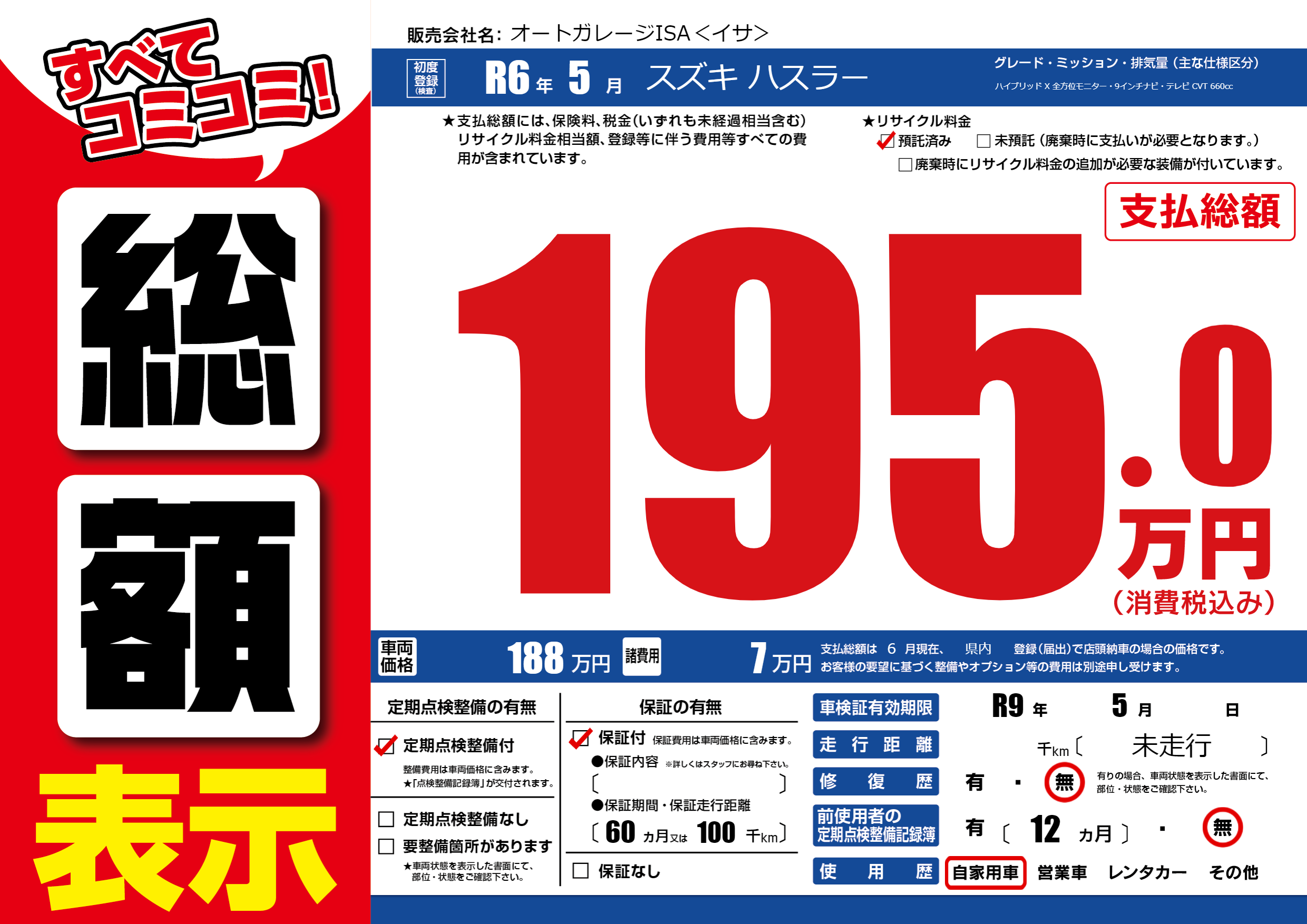 | 車名 | スズキ ハスラー | グレード ミッション 排気量 |