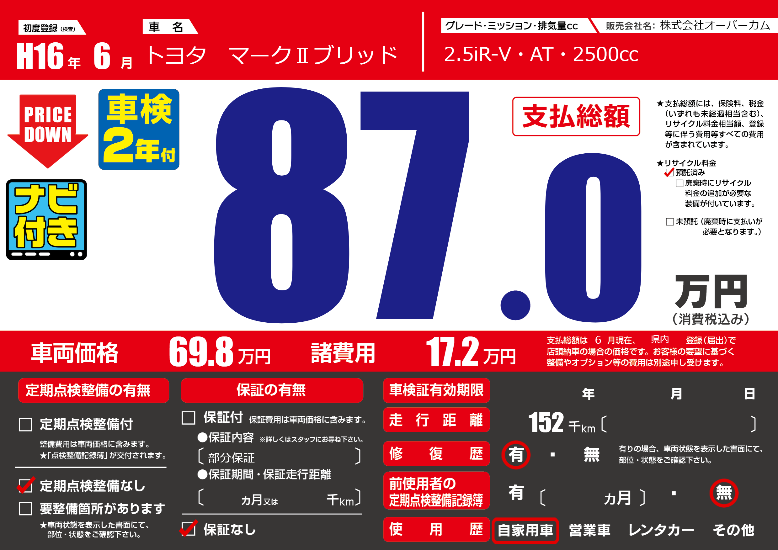| 走行キロ | 15.2万km | 初年度登録 | H16年6月 |