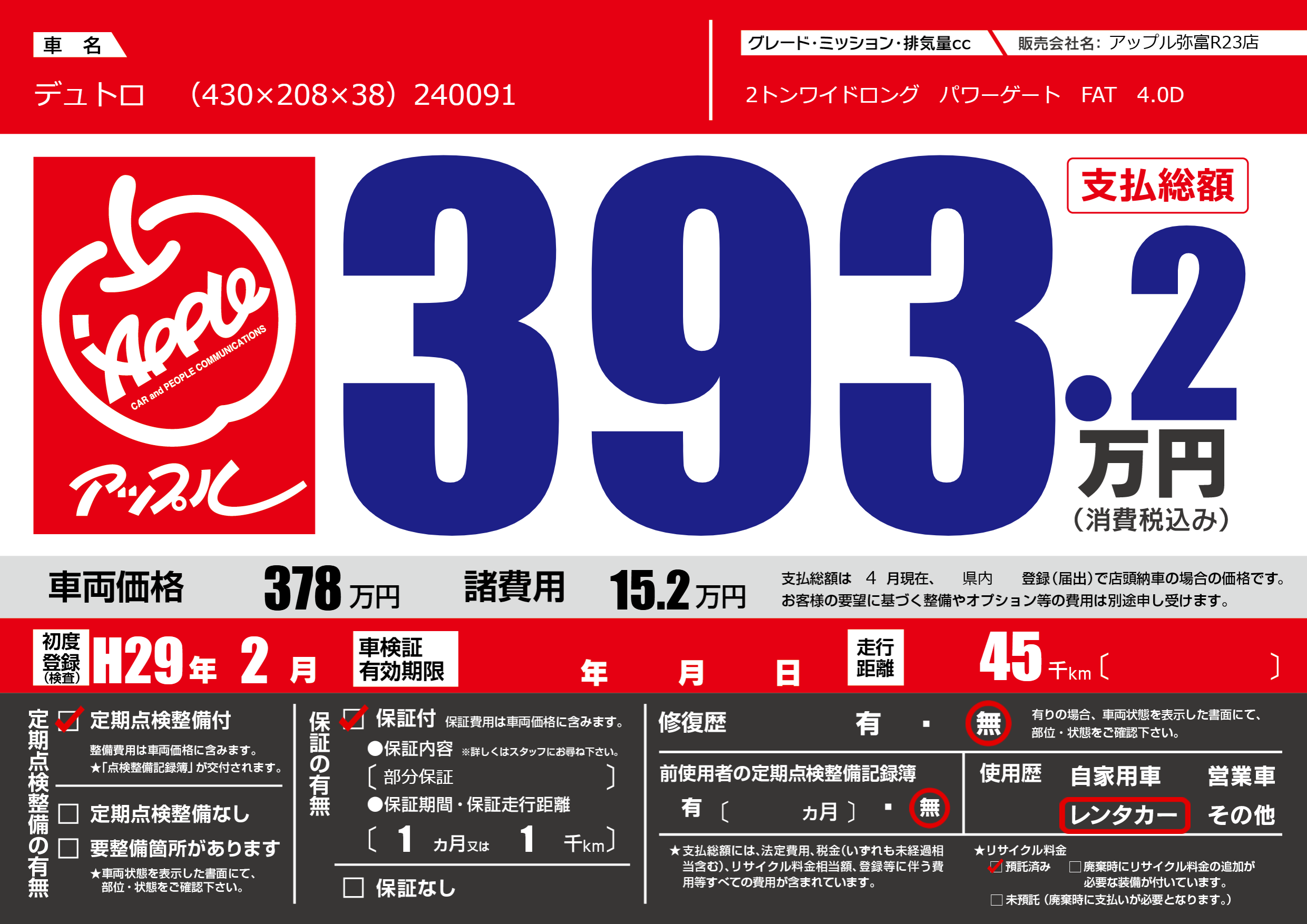 | 車名 | デュトロ (430×208×38)240091 | グレード ミッション 排気量 |