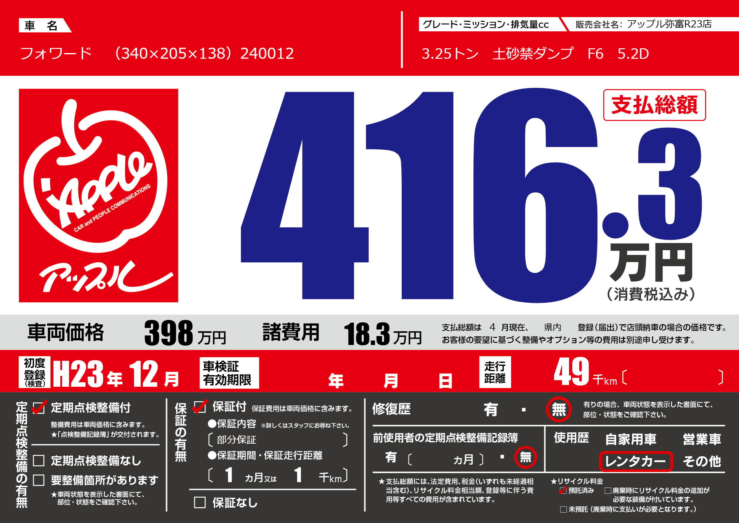 | 車名 | フォワード (340×205×138)240012 | グレード ミッション 排気量 |
