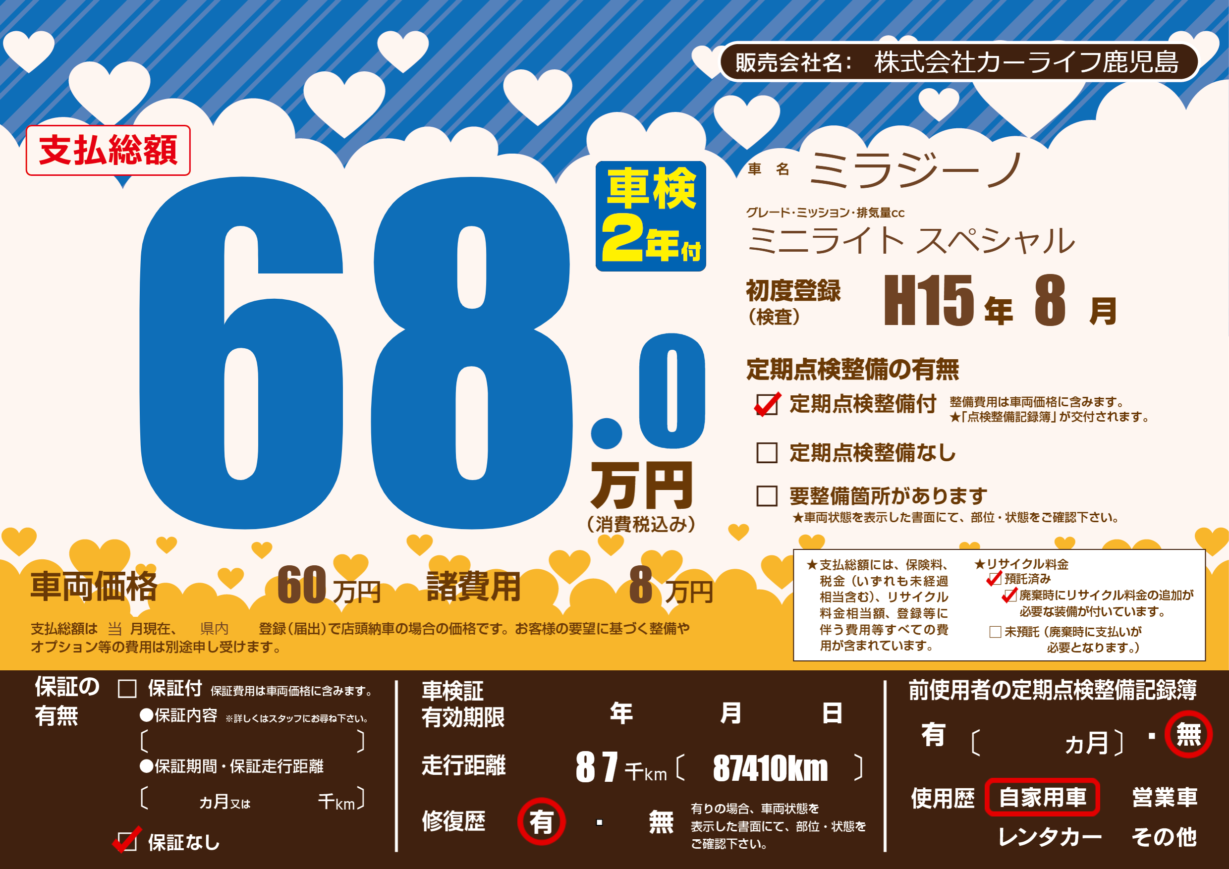 | 走行キロ | 0.8万km | 初年度登録 | H15年8月 |