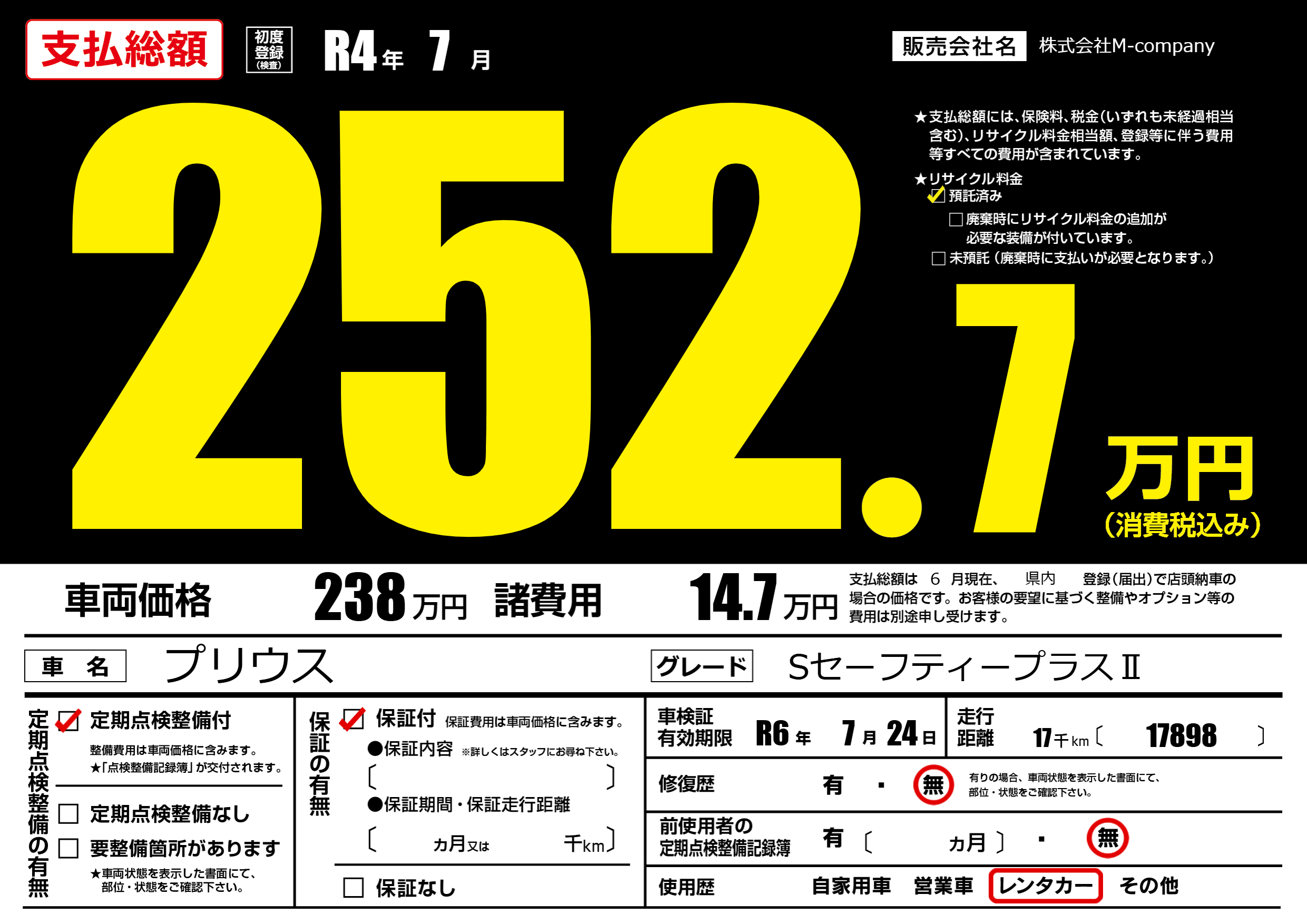 | 車名 | プリウス | グレード ミッション 排気量 |