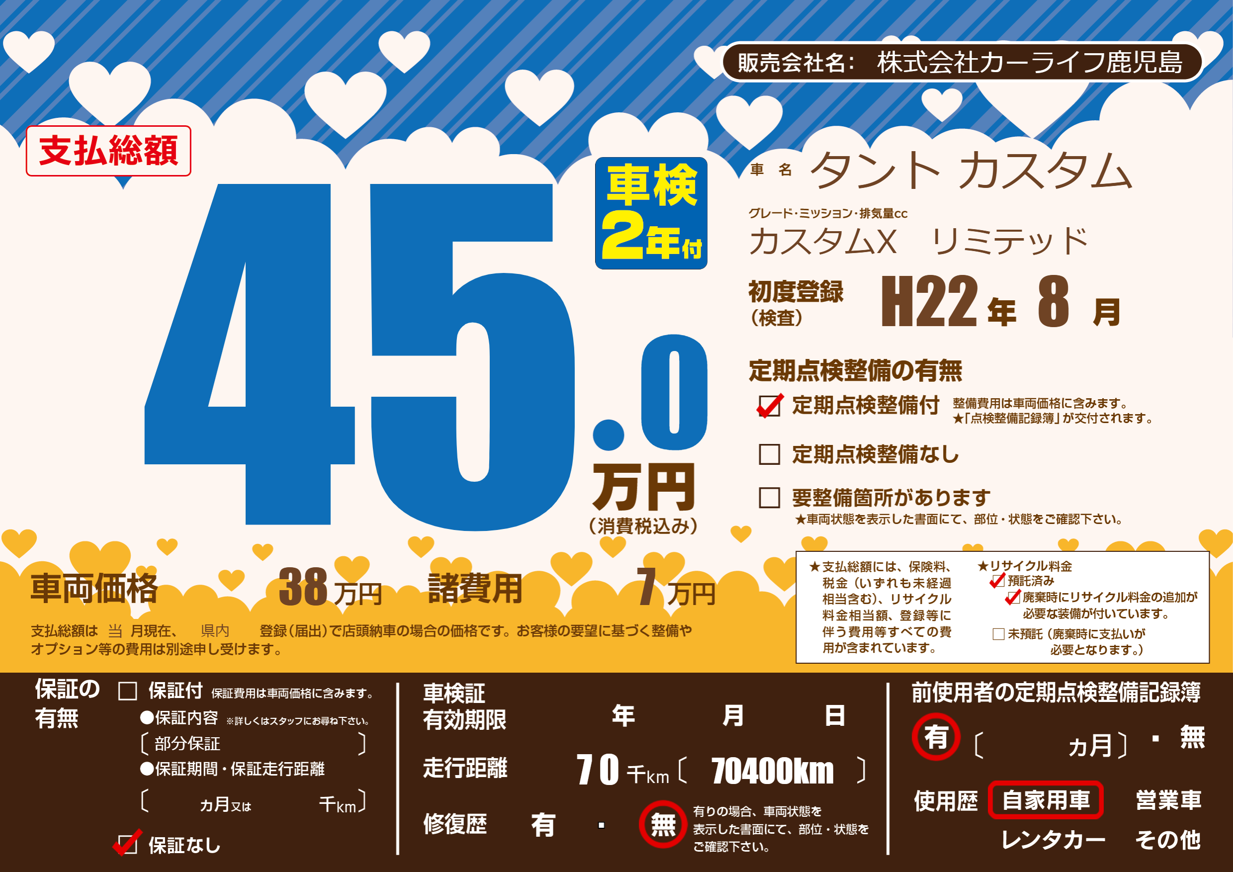 | 車名 | タント カスタム | グレード ミッション 排気量 |