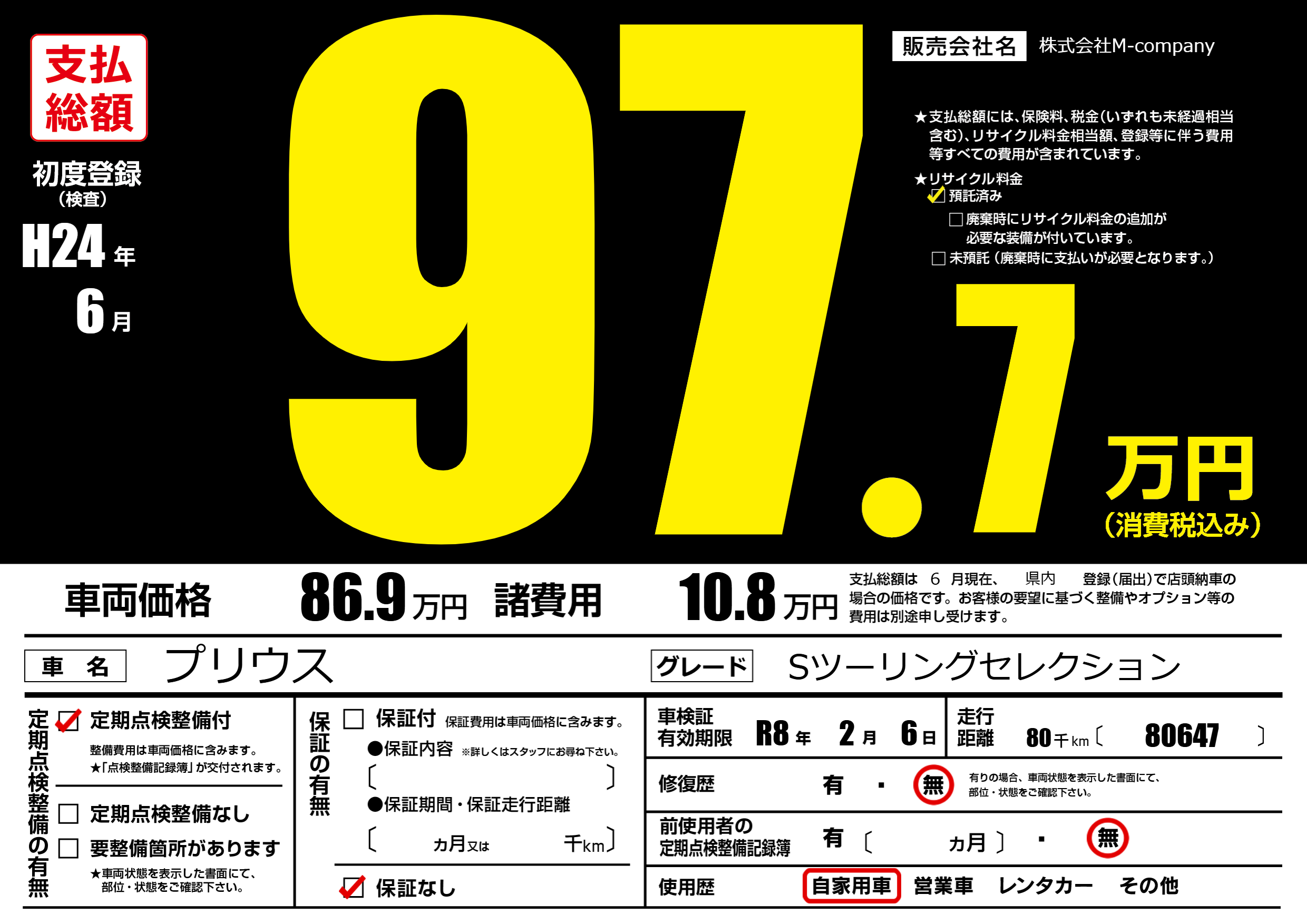 | 走行キロ | 8万km | 初年度登録 | H24年6月 |